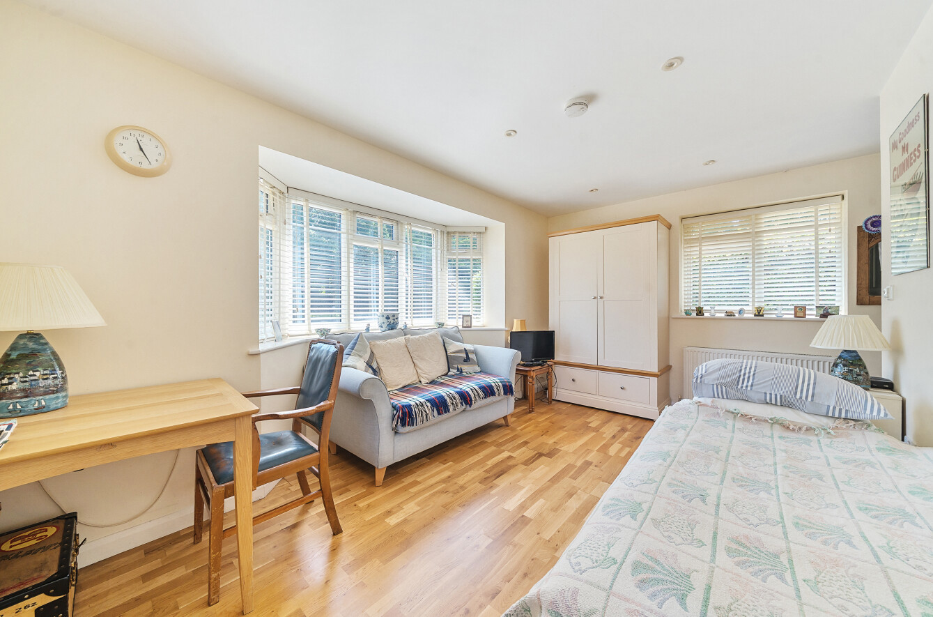 Extended in 2017 to the front of the property, is a fantastic opportunity for completely separate accommodation. A modern bright bedroom with bay window, ensuite wet room and kitchenette, again with its own external door to the garden, completes this beautiful and unique bungalow.