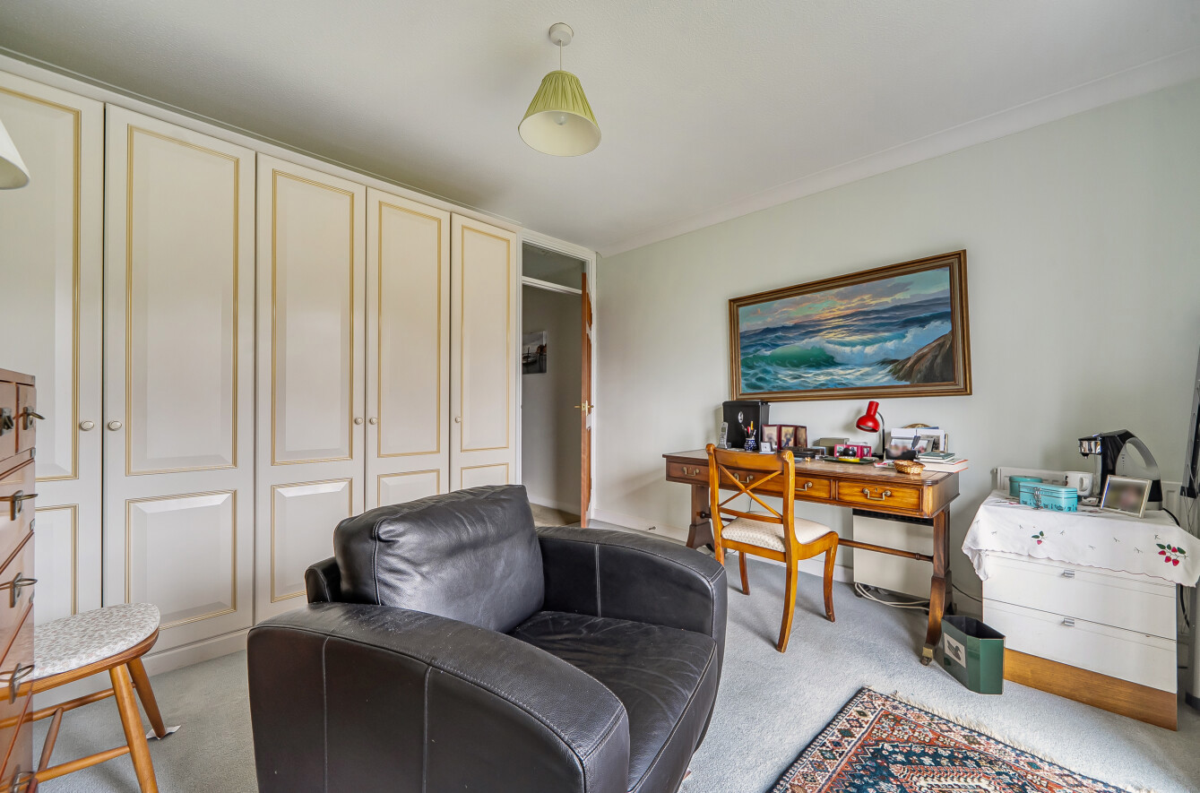 Rear aspect 2nd double bedroom with built in wardrobes and patio door onto a Juliette balcony overlooking the garden and communal grounds beyond