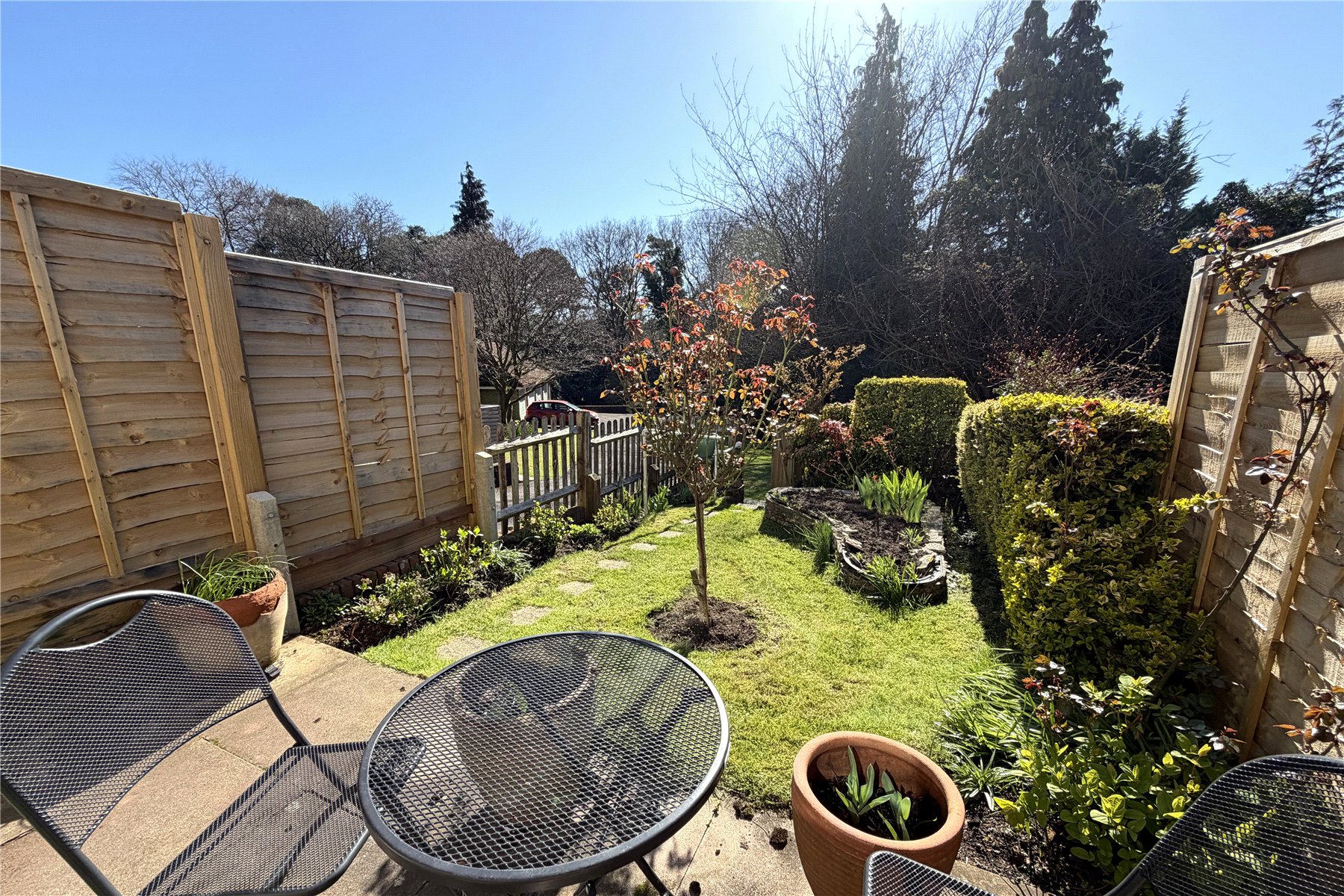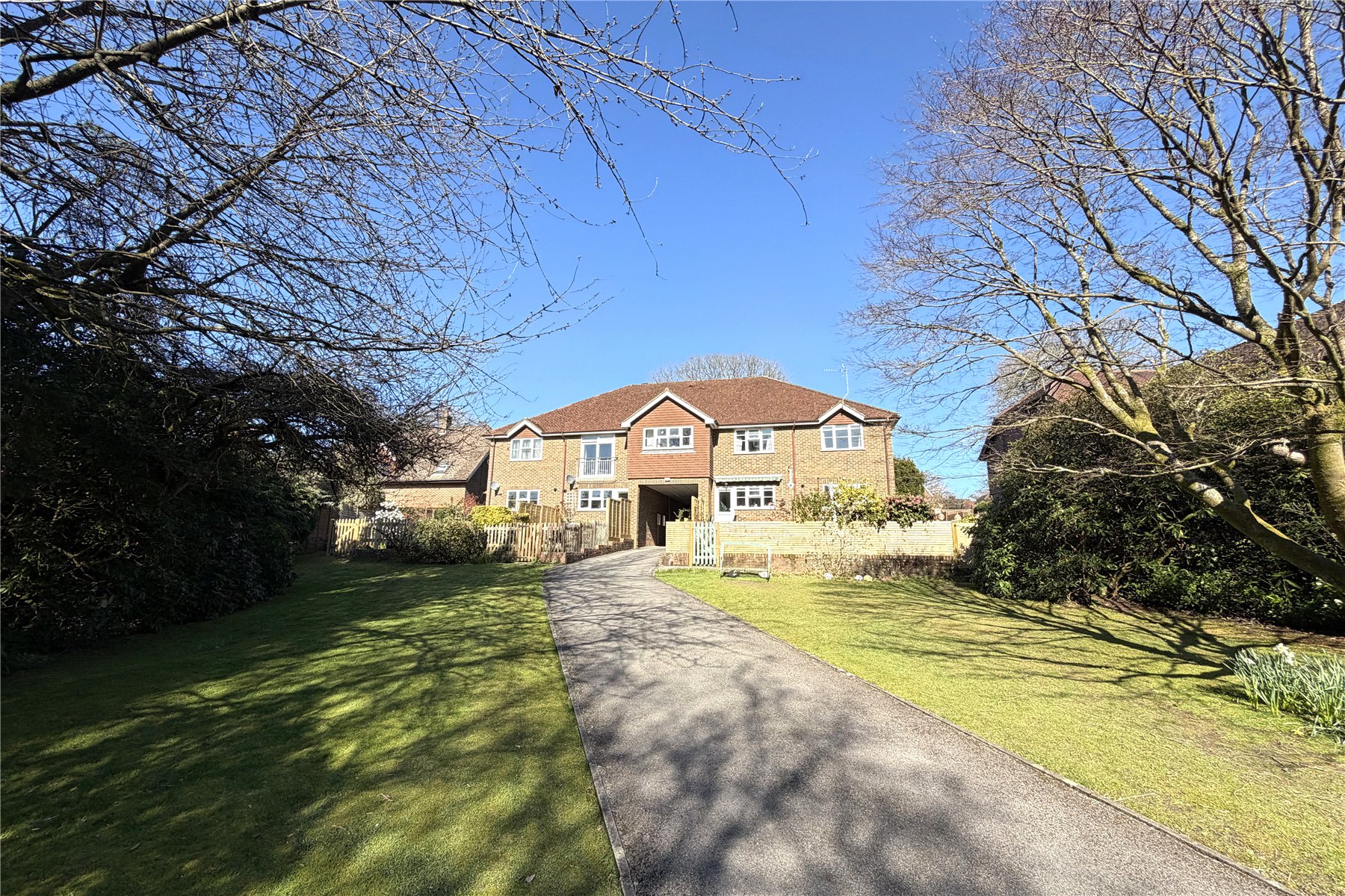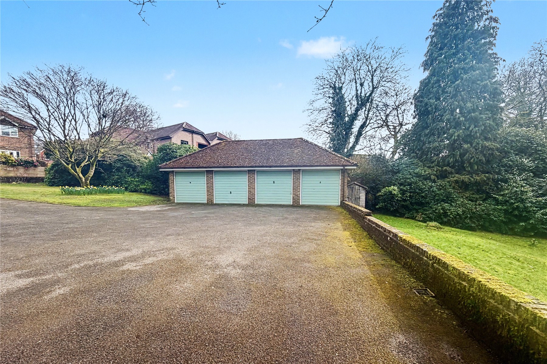 To the rear of the development are communal gardens with a lovely woodland backdrop and driveway parking for four cars in addition to garaging; one of which belongs to no 3