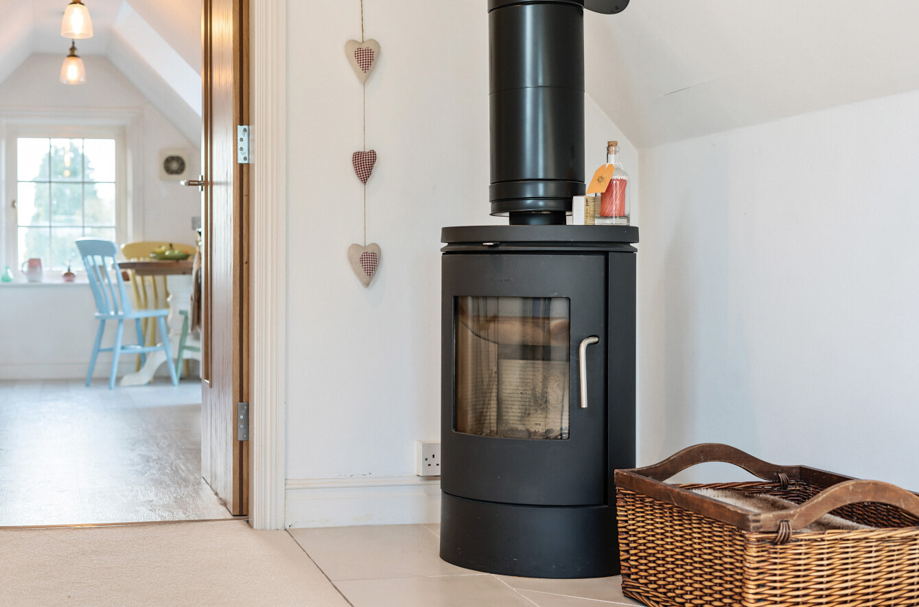 There is a generous T-shaped sitting room with contemporary wood burning stove. A lovely light room thanks to both traditional and velux windows. Beyond this is a modern dual aspect fitted kitchen/dining room, with a range of drawer and cupboard storage, wooden worktops and space for white goods.
