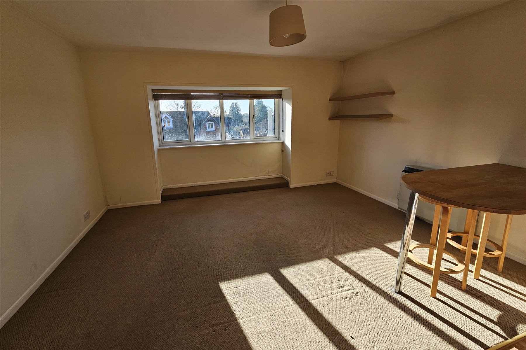 Large open plan living room/kitchen with a large south facing box bay window