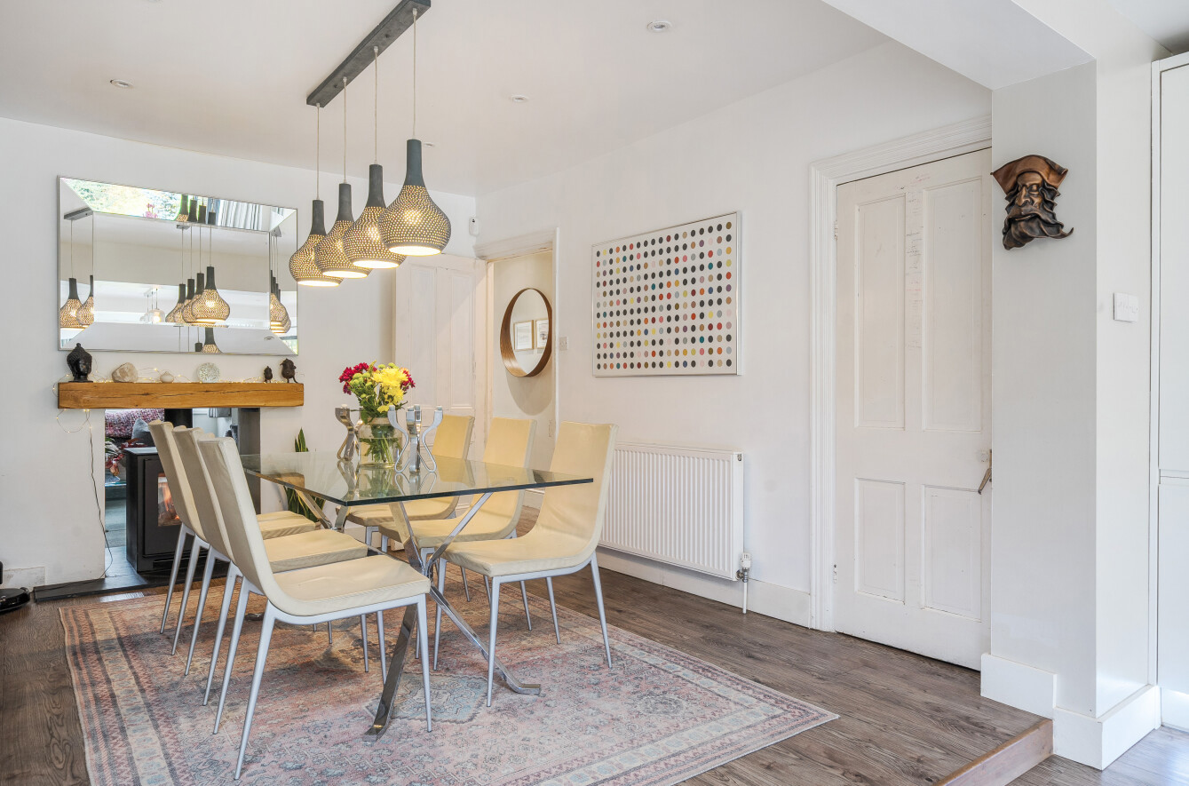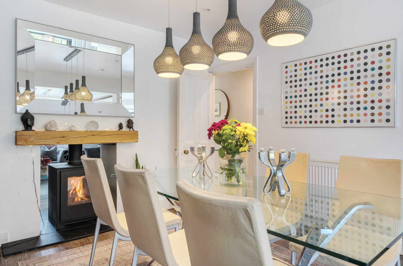 A formal sitting room sits at the front of the house with a deep box bay window (with bespoke fitted plantation wood shutters) and feature wood burning stove which allows a glimpse through to the dining room behind.