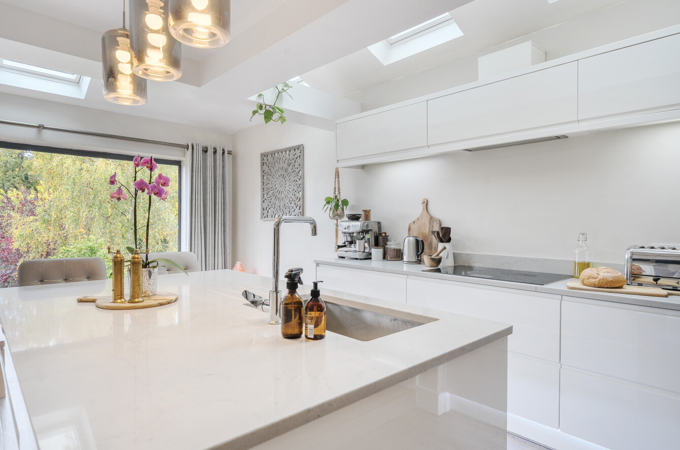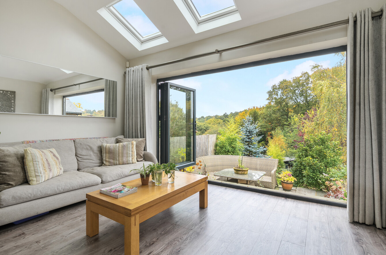 At the rear of the house is a lovely dining room, enjoying the warmth of the aforementioned wood burning stove. This room is open to a modern extended kitchen/family room. Combined this creates a 31 ft deep space perfect for a busy family life and entertaining, the heart of the home, with bi-folding doors to the end which offer wonderful elevated views over the garden onto the woodland of The Golden Valley (N.T).