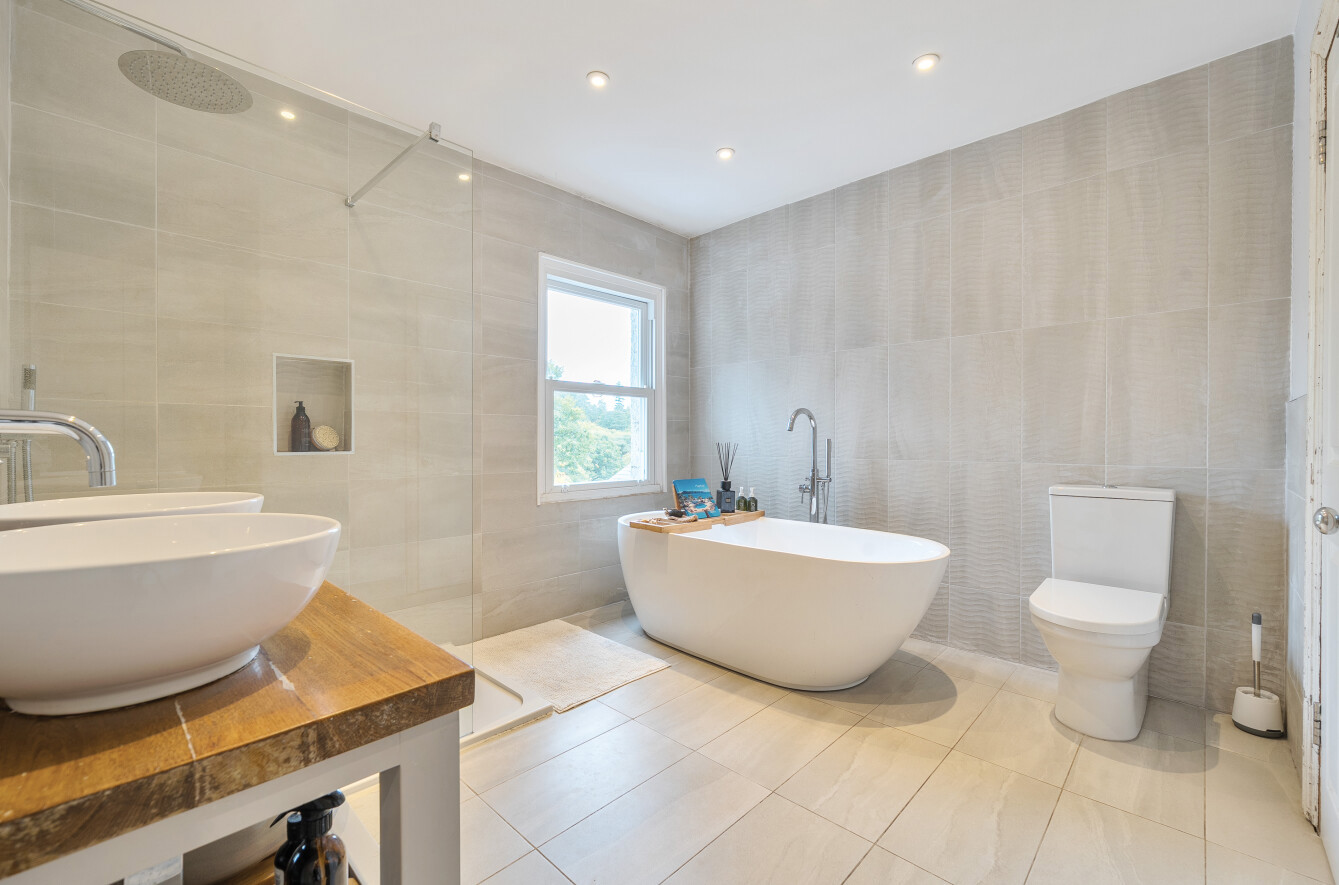 Moving to the 1st floor there are two double bedrooms and a large family bathroom with underfloor heating, free standing bath, walk in shower with waterfall shower head and twin sinks Off the bathroom is a laundry/boiler room. The master bedroom benefits from built in wardrobes and bespoke wooden shutters to both windows, while the 2nd bedroom enjoys woodland views and has a charming ornamental fireplace.
