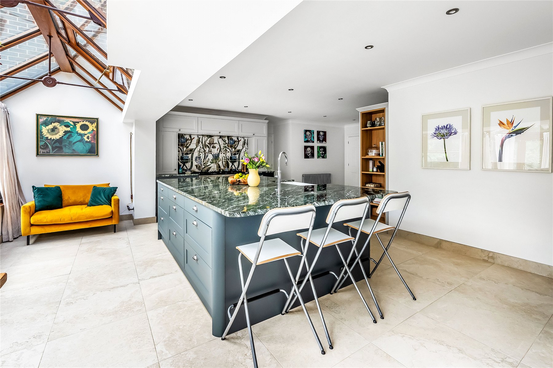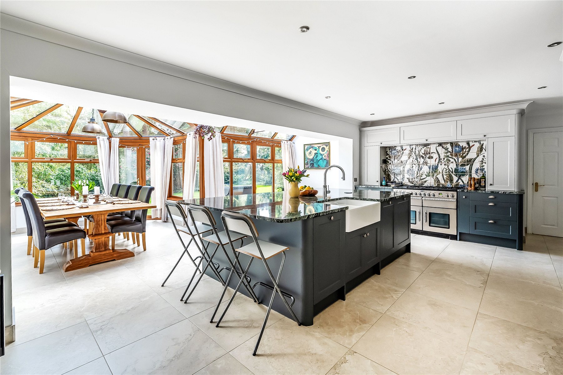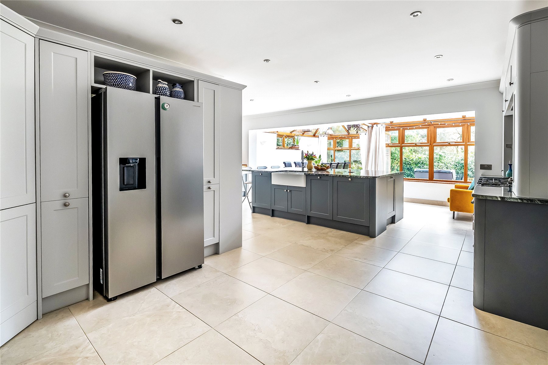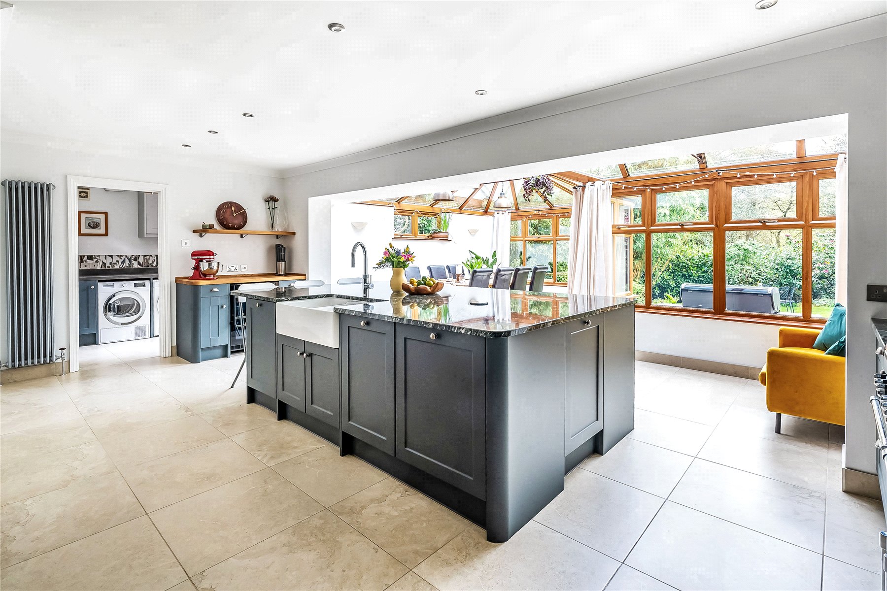 The reception rooms are incredibly versatile. Starting with a dual aspect sitting room approached from the hallway via double doors, this runs the full depth of the house with patio doors onto the rear garden at the end. Centrally positioned is an open fire within a wall of bespoke shelving and cupboard storage, an alternate, slightly more cosy space is the rear aspect family room/snug. Contrasting wonderfully with this is the superb part vaulted open plan kitchen/dining room/conservatory; the real heart of the home, whether for busy family life or hosting parties. Of particular note are the conservatory dining area which overlooks the gardens (with doors opening directly out onto them) and the large central kitchen island. Ceramic tiled flooring links everything together allowing for natural movement around the different areas. The kitchen was fitted approximately five years ago and benefits from a twin sink with Quooker tap, corner pantry cupboard and pull out larder, plus integrated dishwasher, wine fridge and two bin stores with further space for a range cooker and American style fridge freezer.