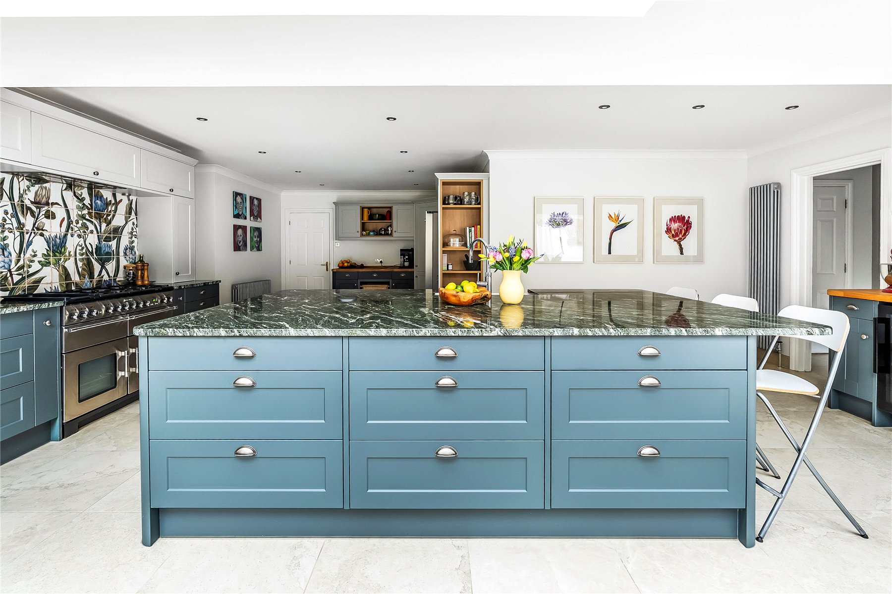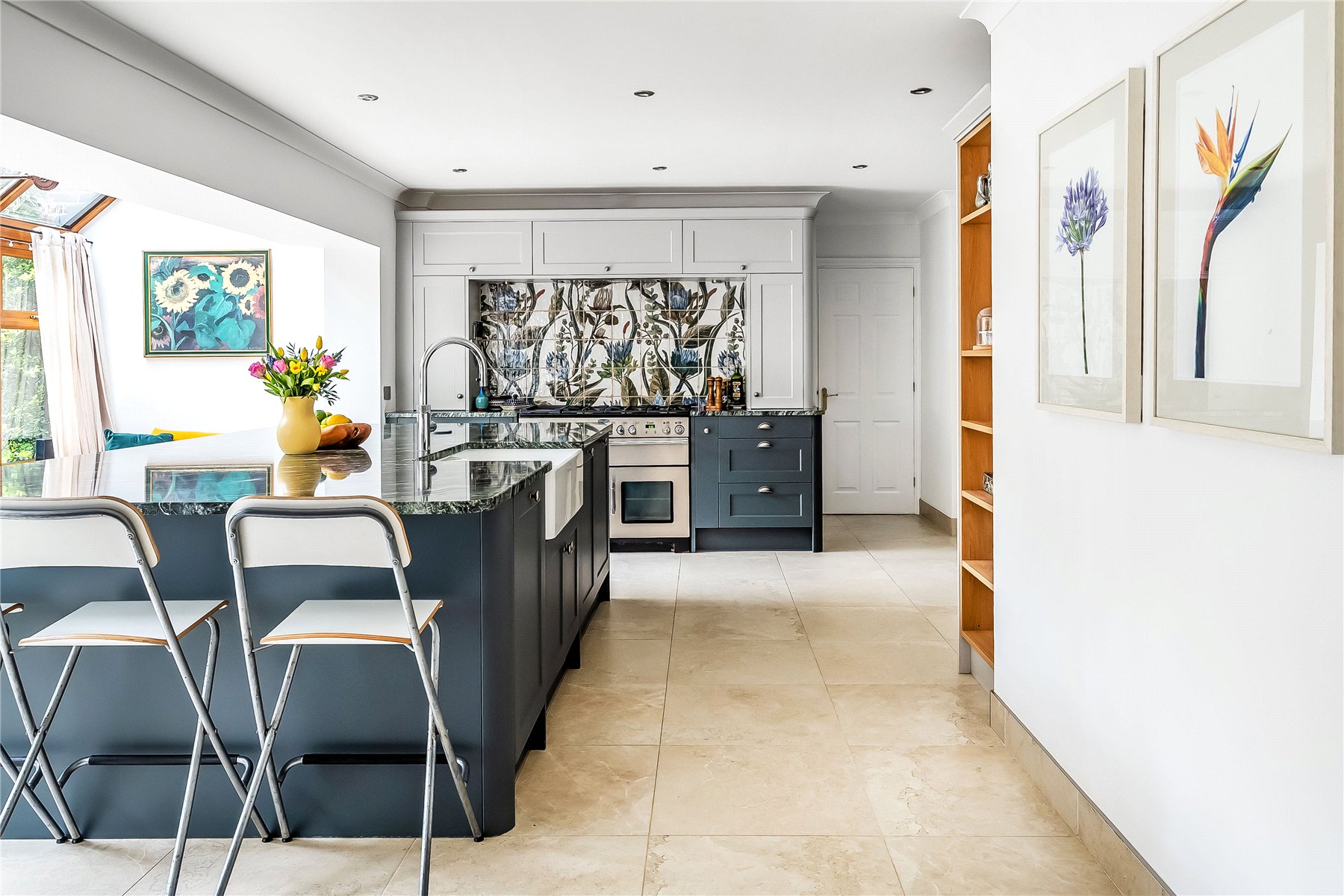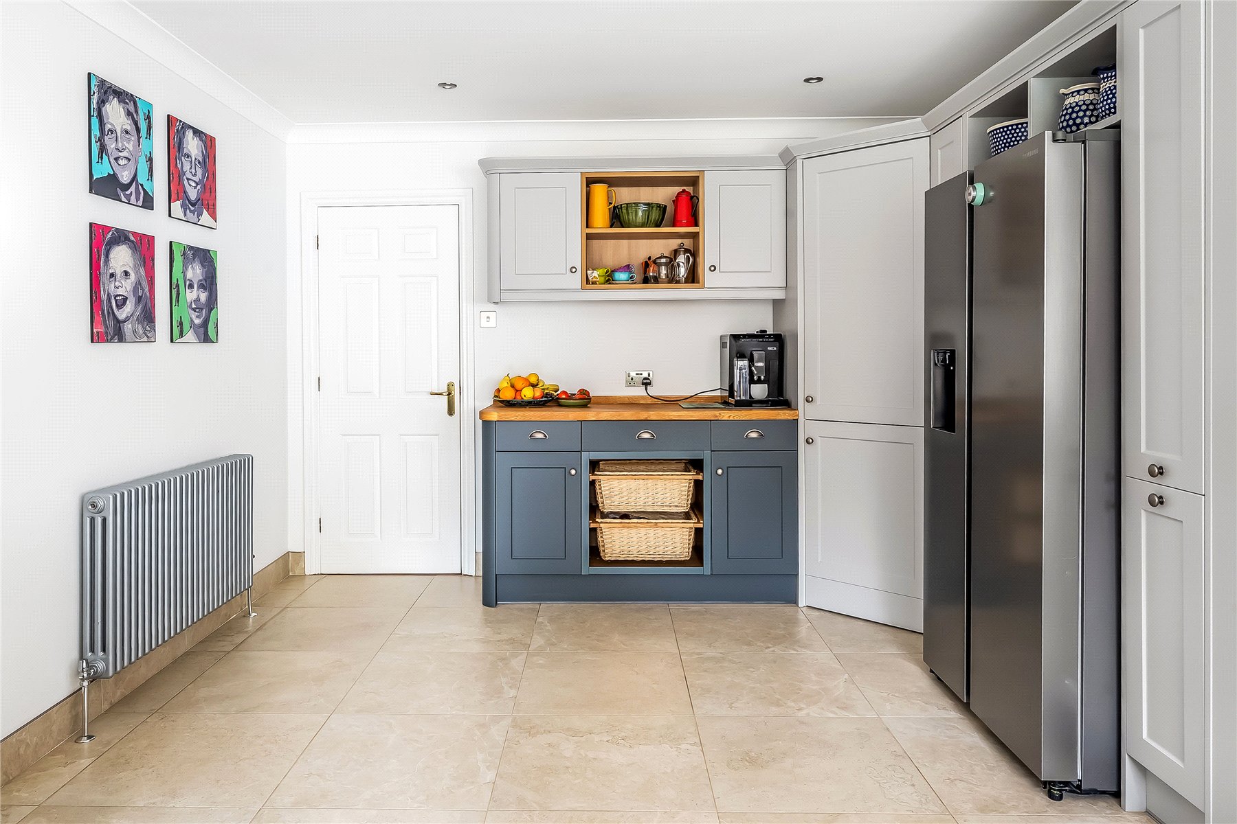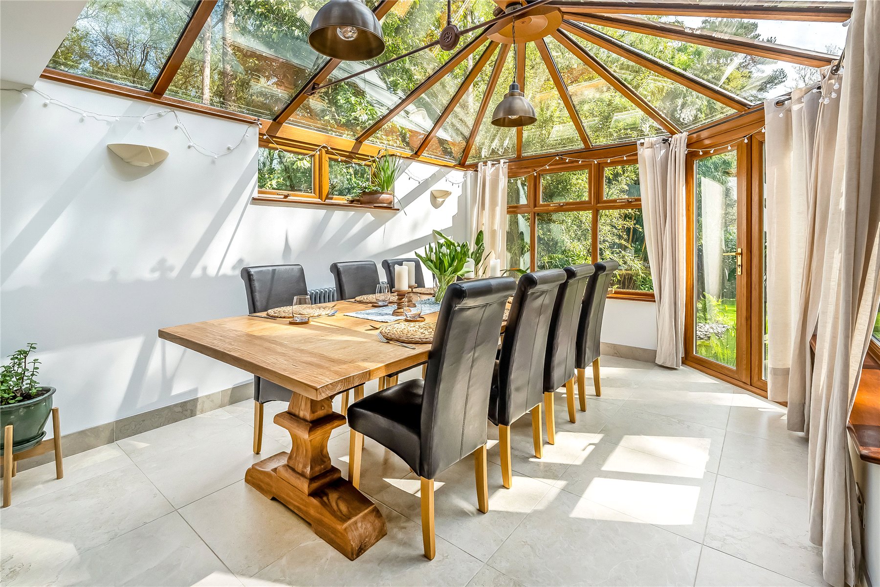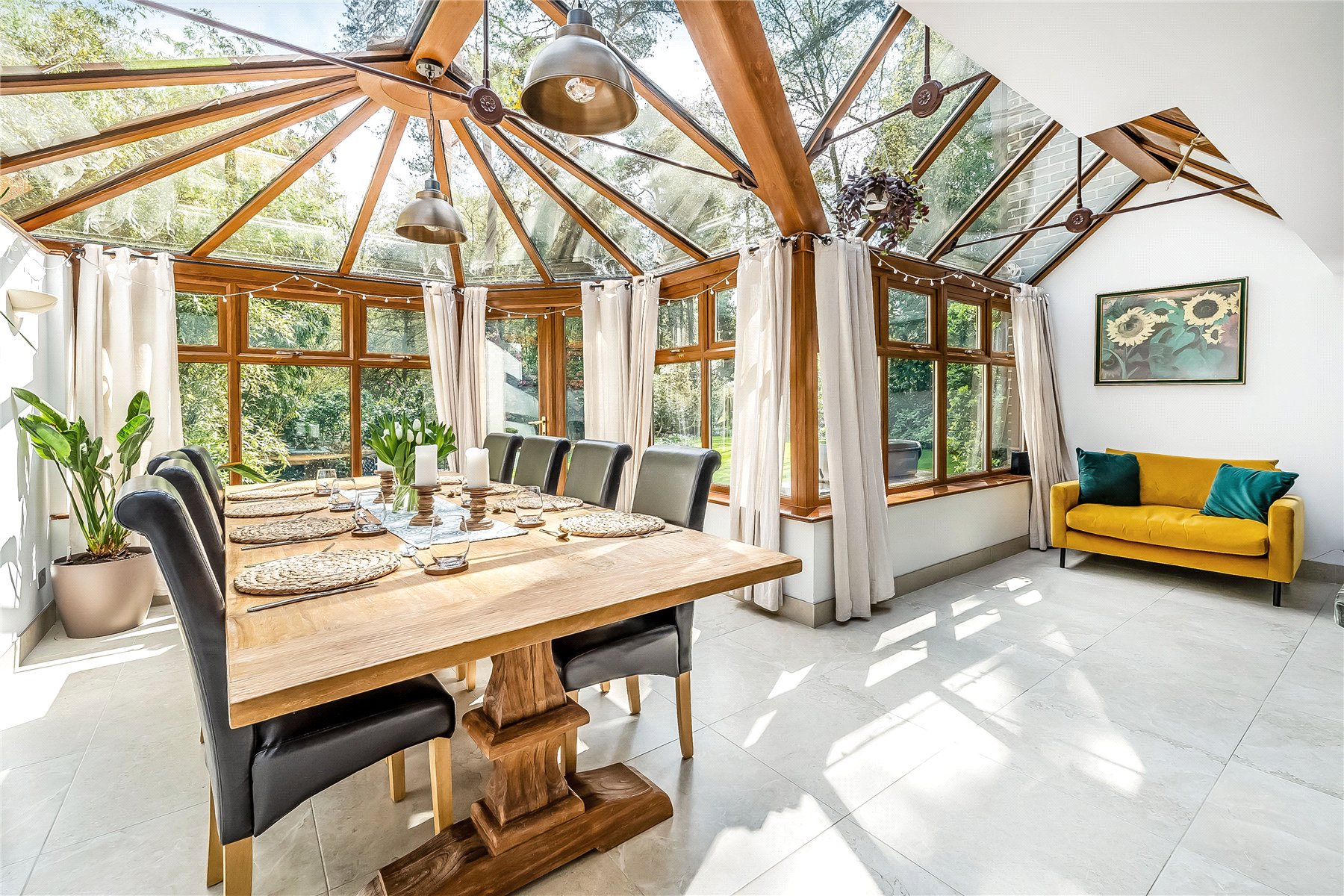 The reception rooms are incredibly versatile. Starting with a dual aspect sitting room approached from the hallway via double doors, this runs the full depth of the house with patio doors onto the rear garden at the end. Centrally positioned is an open fire within a wall of bespoke shelving and cupboard storage, an alternate, slightly more cosy space is the rear aspect family room/snug. Contrasting wonderfully with this is the superb part vaulted open plan kitchen/dining room/conservatory; the real heart of the home, whether for busy family life or hosting parties. Of particular note are the conservatory dining area which overlooks the gardens (with doors opening directly out onto them) and the large central kitchen island. Ceramic tiled flooring links everything together allowing for natural movement around the different areas. The kitchen was fitted approximately five years ago and benefits from a twin sink with Quooker tap, corner pantry cupboard and pull out larder, plus integrated dishwasher, wine fridge and two bin stores with further space for a range cooker and American style fridge freezer.