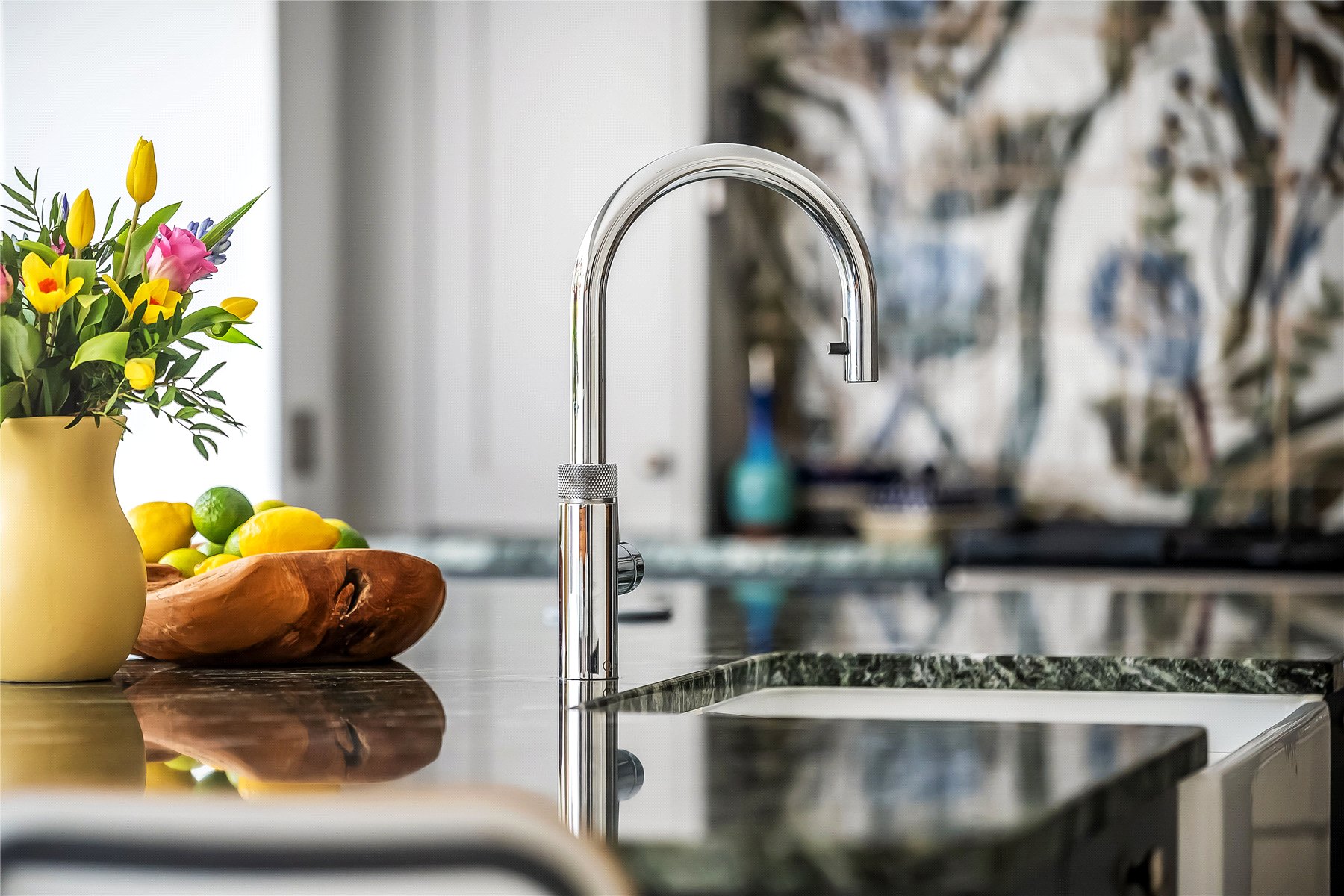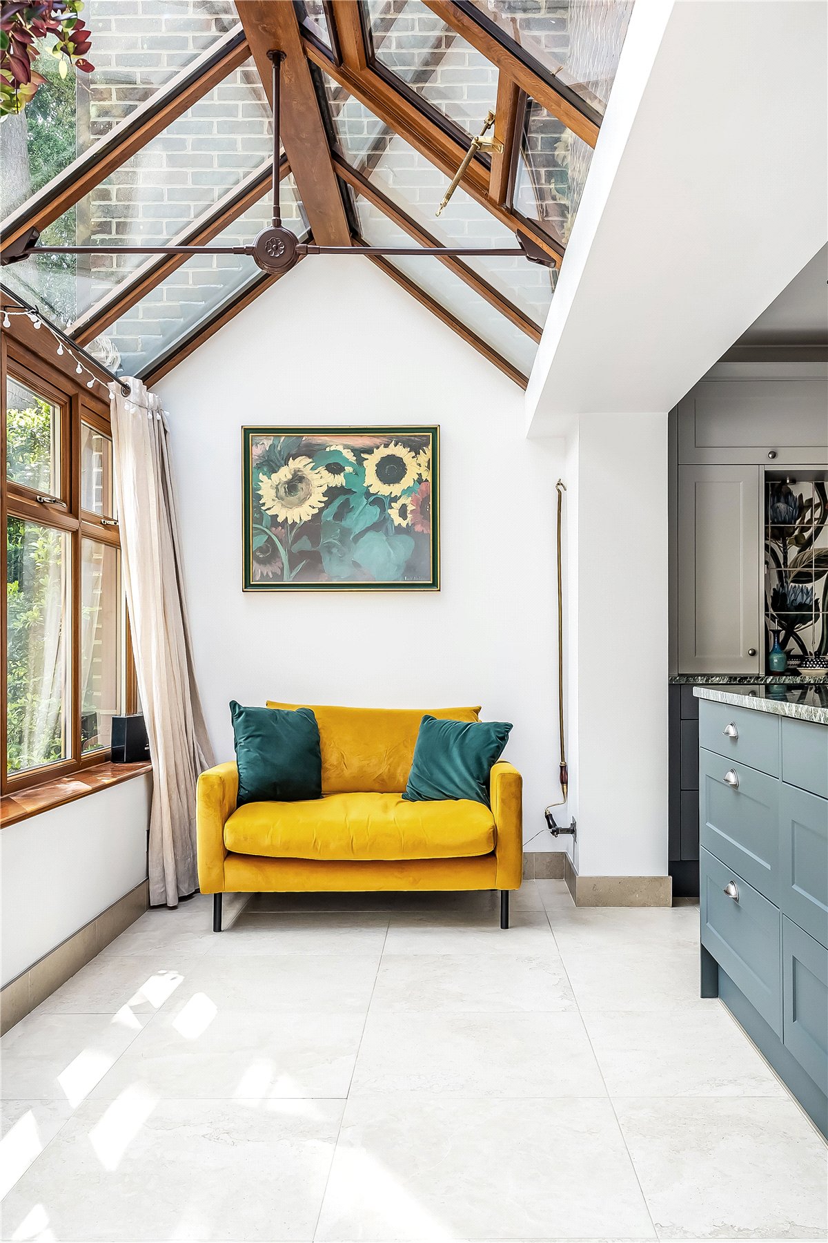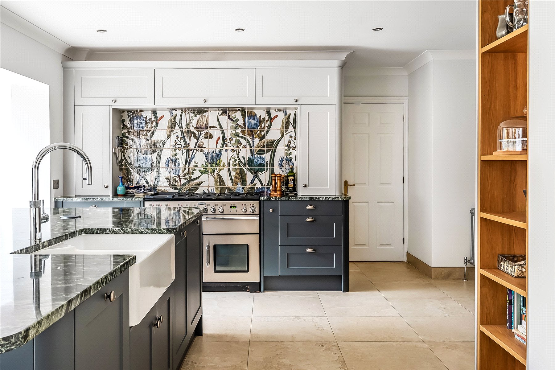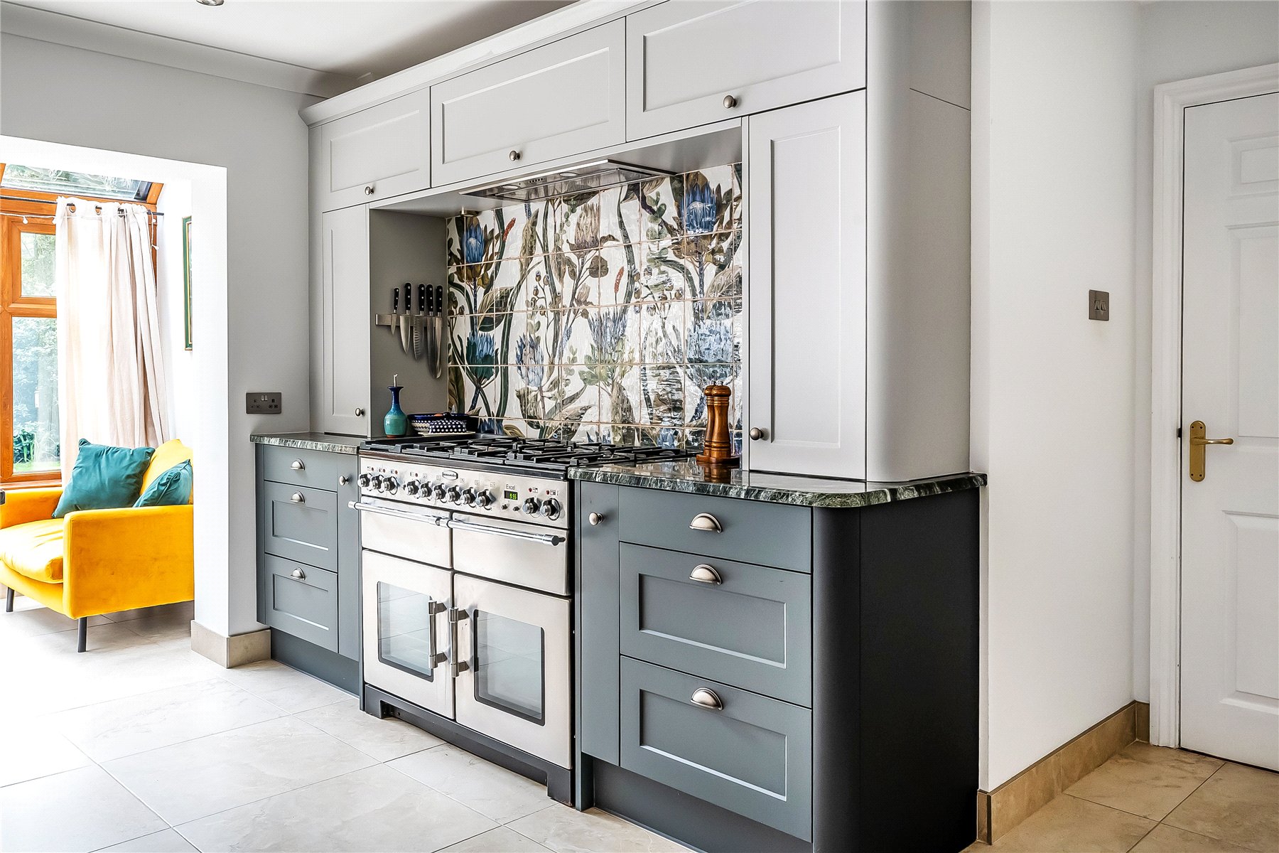 The reception rooms are incredibly versatile. Starting with a dual aspect sitting room approached from the hallway via double doors, this runs the full depth of the house with patio doors onto the rear garden at the end. Centrally positioned is an open fire within a wall of bespoke shelving and cupboard storage, an alternate, slightly more cosy space is the rear aspect family room/snug. Contrasting wonderfully with this is the superb part vaulted open plan kitchen/dining room/conservatory; the real heart of the home, whether for busy family life or hosting parties. Of particular note are the conservatory dining area which overlooks the gardens (with doors opening directly out onto them) and the large central kitchen island. Ceramic tiled flooring links everything together allowing for natural movement around the different areas. The kitchen was fitted approximately five years ago and benefits from a twin sink with Quooker tap, corner pantry cupboard and pull out larder, plus integrated dishwasher, wine fridge and two bin stores with further space for a range cooker and American style fridge freezer.
