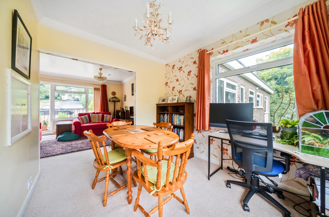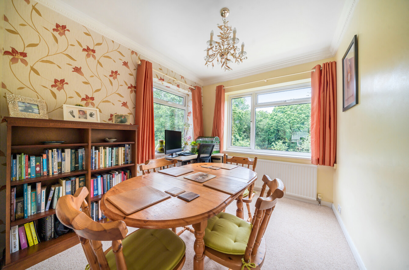 To the end of the hallway is a large sitting room. Large windows ensure plenty of natural light, with a patio door opening onto a generous south facing patio. The dining room sits to the side of the sitting room and benefits from a double aspect and elevated views over the communal grounds and The Golden Valley woodland. (Original parquet flooring is retained underneath the current carpeting.)
