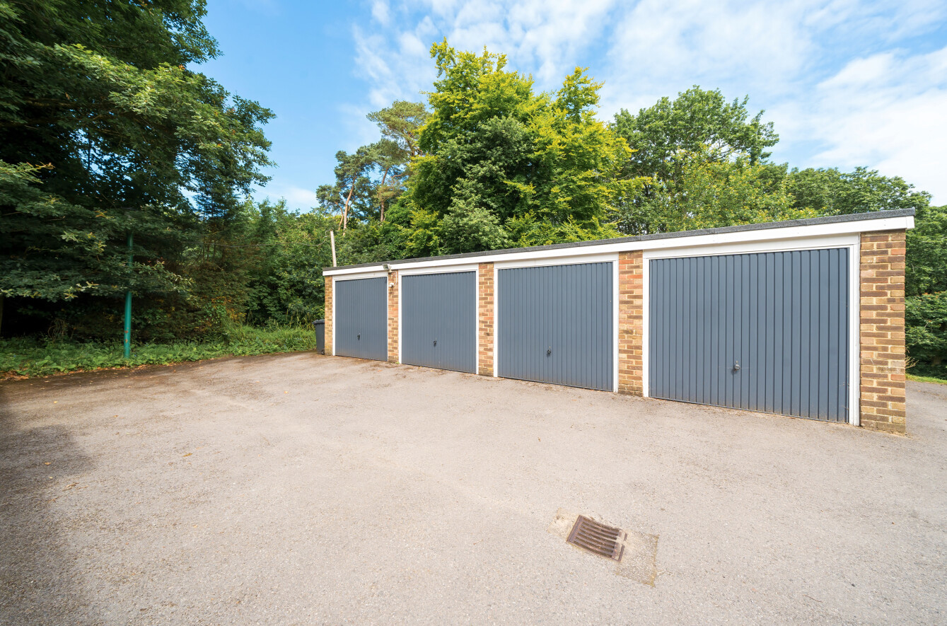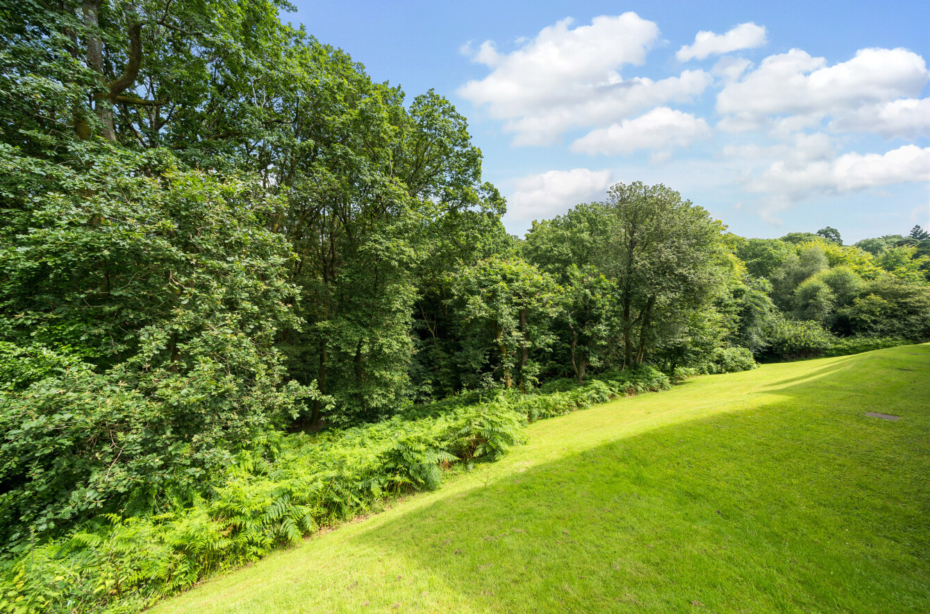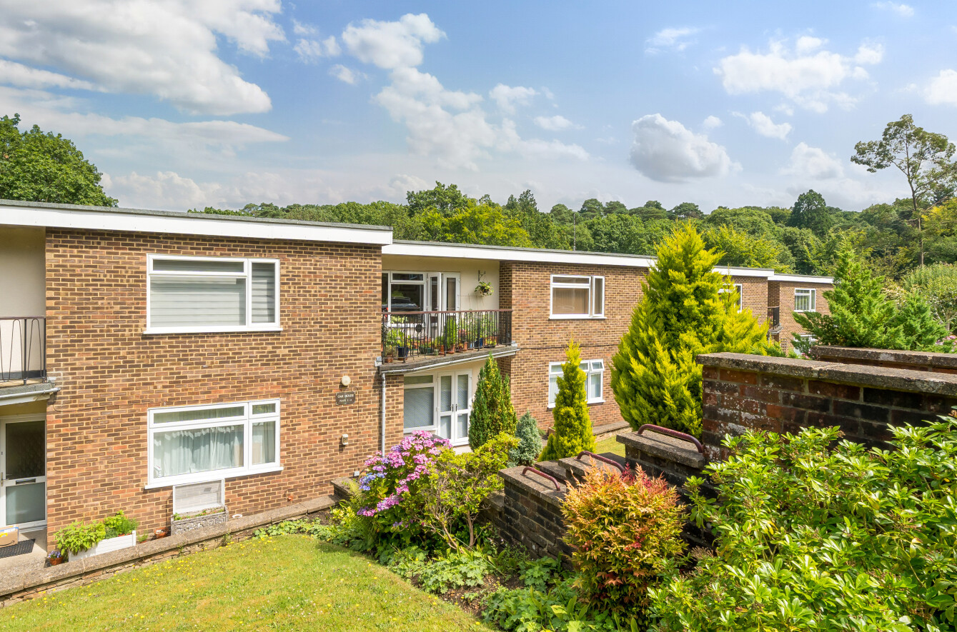 Situated within communal gardens to both the front and rear predominantly laid to lawn with a woodland backdrop behind.