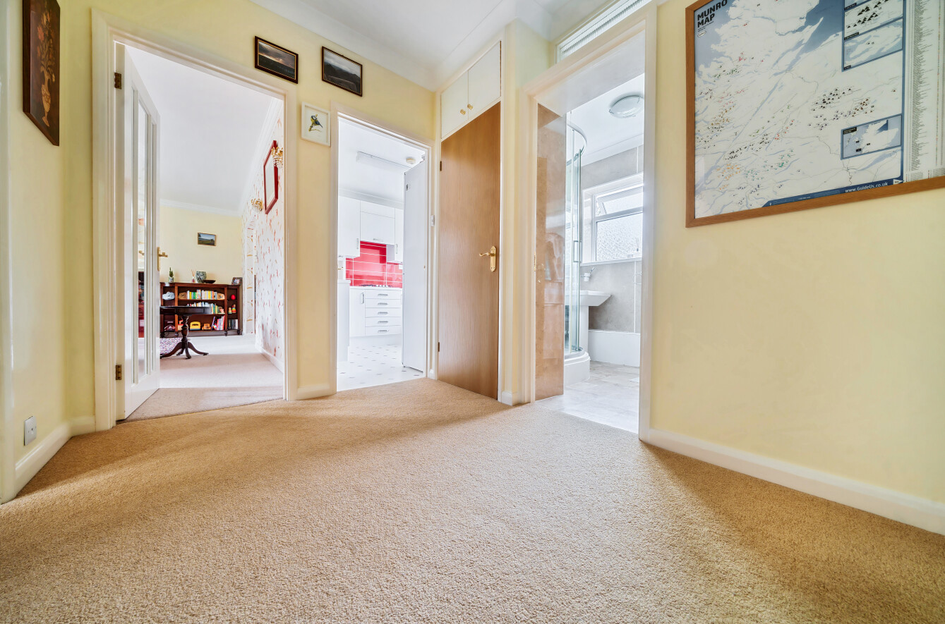 To the side of Oak House is a block of garages, which this home benefits from one of. Further parking is available on the road in front of the building. A small flight of steps takes you down to Oak House and at ground level you find the private front door to No 4. An entrance hall with storage cupboards greets you, alongside a private staircase to the 1st floor onto a large hallway with further storage cupboard.