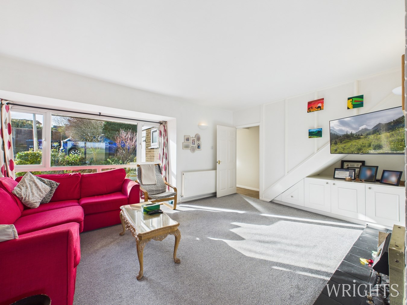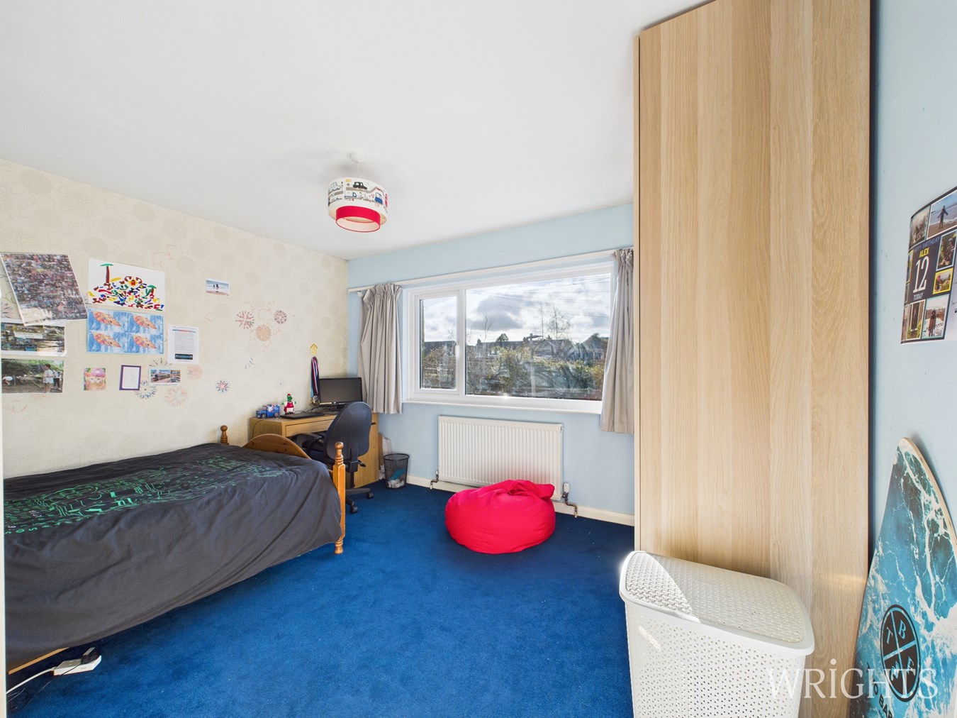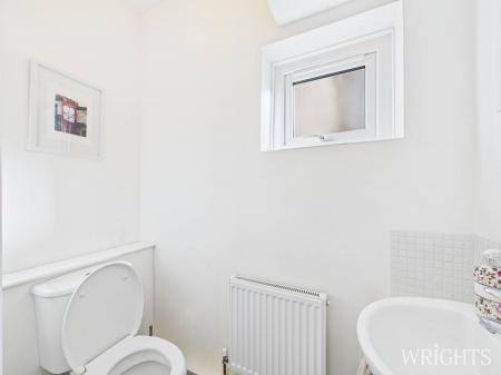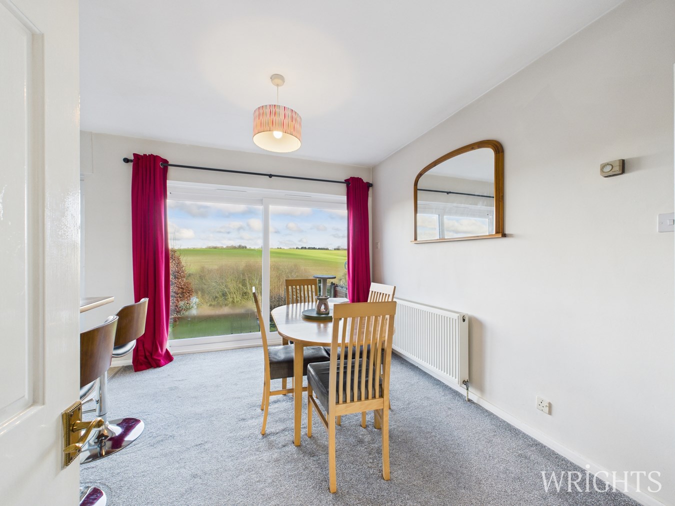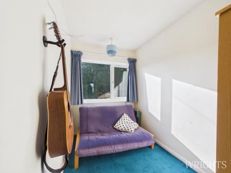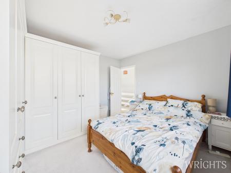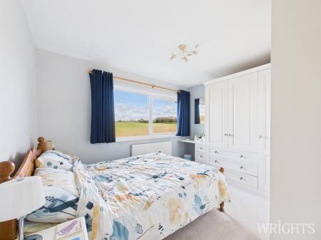 On the first floor, a roomy landing with built-in cupboards and loft access gives way to four good-sized bedrooms. The principal bedroom enjoys fitted double wardrobes and uninterrupted views over neighbouring fields. A second spacious double bedroom is positioned at the front of the property, while the remaining two rooms offer versatility as additional bedrooms or home working spaces. The family bathroom is generously proportioned.