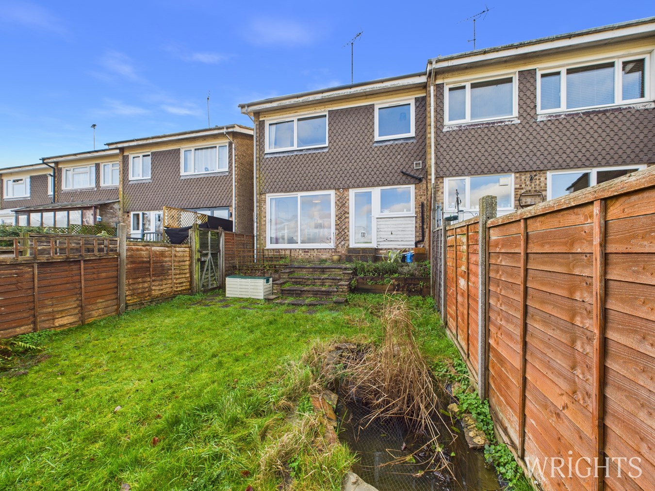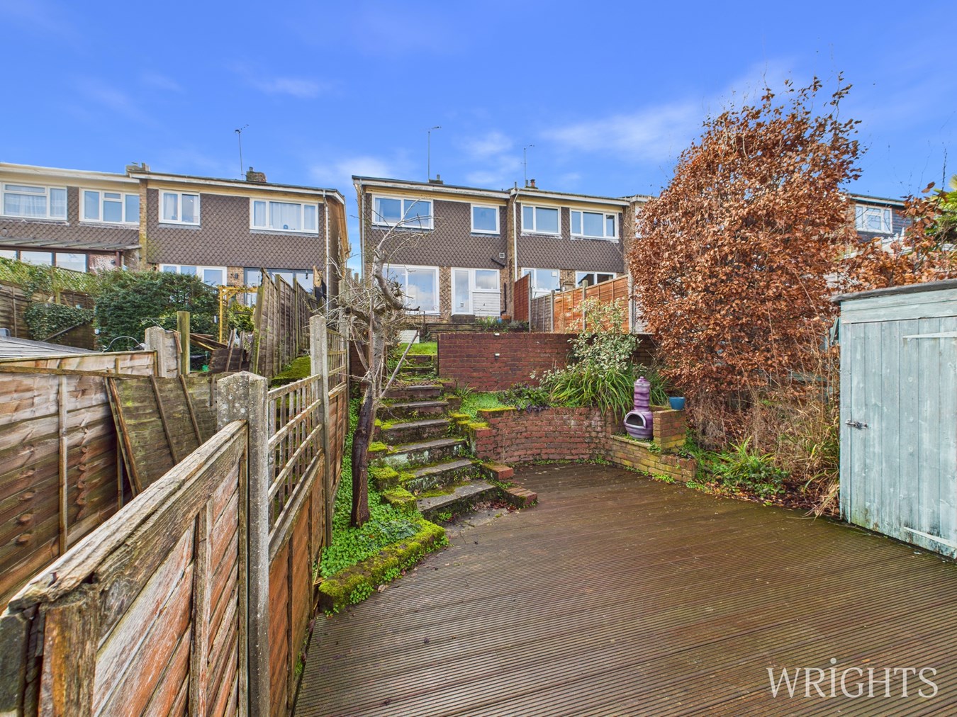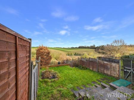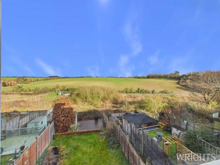 The home enjoys a peaceful, private rear garden arranged over multiple levels and bordered by open countryside. A spacious decked area provides an excellent setting for outdoor dining and entertaining, with steps leading down to a neatly kept lawn below. There is a Garage En-Bloc and the local area offers unrestricted street parking.