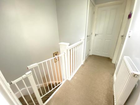 Landing with white painted balustrade, fitted carpet, built-in cupboard housing hot water tank.