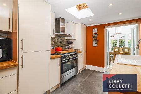 Kitchen/Breakfast Room - 3.91m x 3.18m (12'10 x 10'5) - Two VELUX sky light windows and uPVC double glazed doors to Conservatory. Range of Cream contemporary wall and base units with central island unit. housing single drainer sink unit. Wooden worksurfaces. Space for Range cooker. Integrated fridge/freezer. Plumbing for washing machine. Cupboard housing wall mounted gas boiler. Recessed ceiling spotlights. Tiled floor.