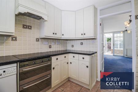 Kitchen - 3.00m x 2.72m (9'10 x 8'11) - Front aspect uPVC double glazed window. Range of wall and base mounted units with rolled edge worksurfaces over. Inset one and half bowl single drainer sink unit. Mixer tap over. Plumbing for washing machine and dishwasher. Built in electric four ring hob. Built in oven below. (please note this is not working). Cupboard housing gas central heating boiler. Tiled floor.