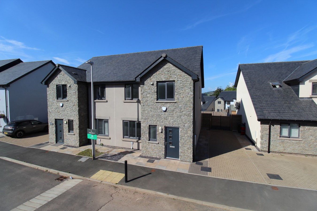 This brand new, semi-detached house is a wonderful family home. On the ground floor there is an entrance hall, cloakroom, living room and kitchen/diner with an attractive range of cupboards, integrated oven, hob, fridge/freezer, dishwasher and washing machin. Patio doors open onto the garden. Upstairs there are three bedrooms, one of which is en-suite and good size family bathroom with bath and separate shower. Outside there is parking and an easily managed garden with views of the Beacons.