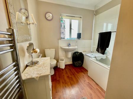 FAMILY BATHROOM Obscured UPVC double glazed window to the rear elevation, skimmed and coved ceiling, inset downlighters, stainless steel heated towel rail, laminate flooring, fitted with a three piece suite comprising low level WC, wash hand basin with mixer tap, 'P' shaped bath with taps with shower screen and fitted Triton T300 shower over.