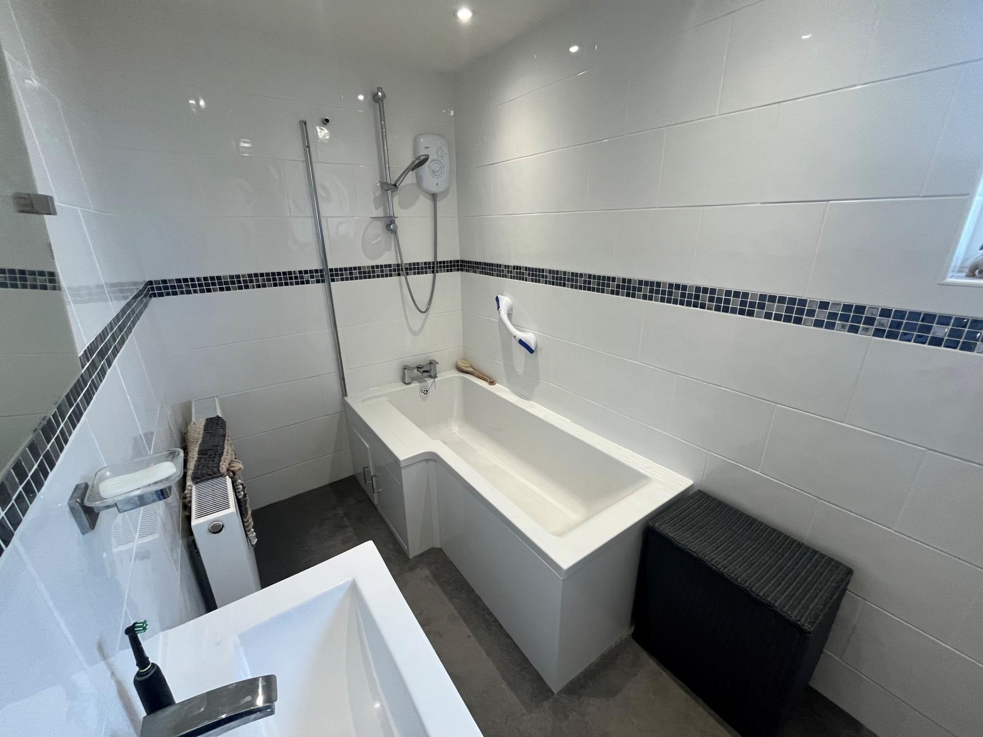 BATHROOM 5' 4" x 9' 10" (1.63m x 3.00m) P-shaped bath with electric shower over, pedestal wash hand basin, recessed shower cabinet (excluded from the room measurement). Fully tiled walls, obscure glazed UPVC window, recessed ceiling lights, radiator, extractor fan.