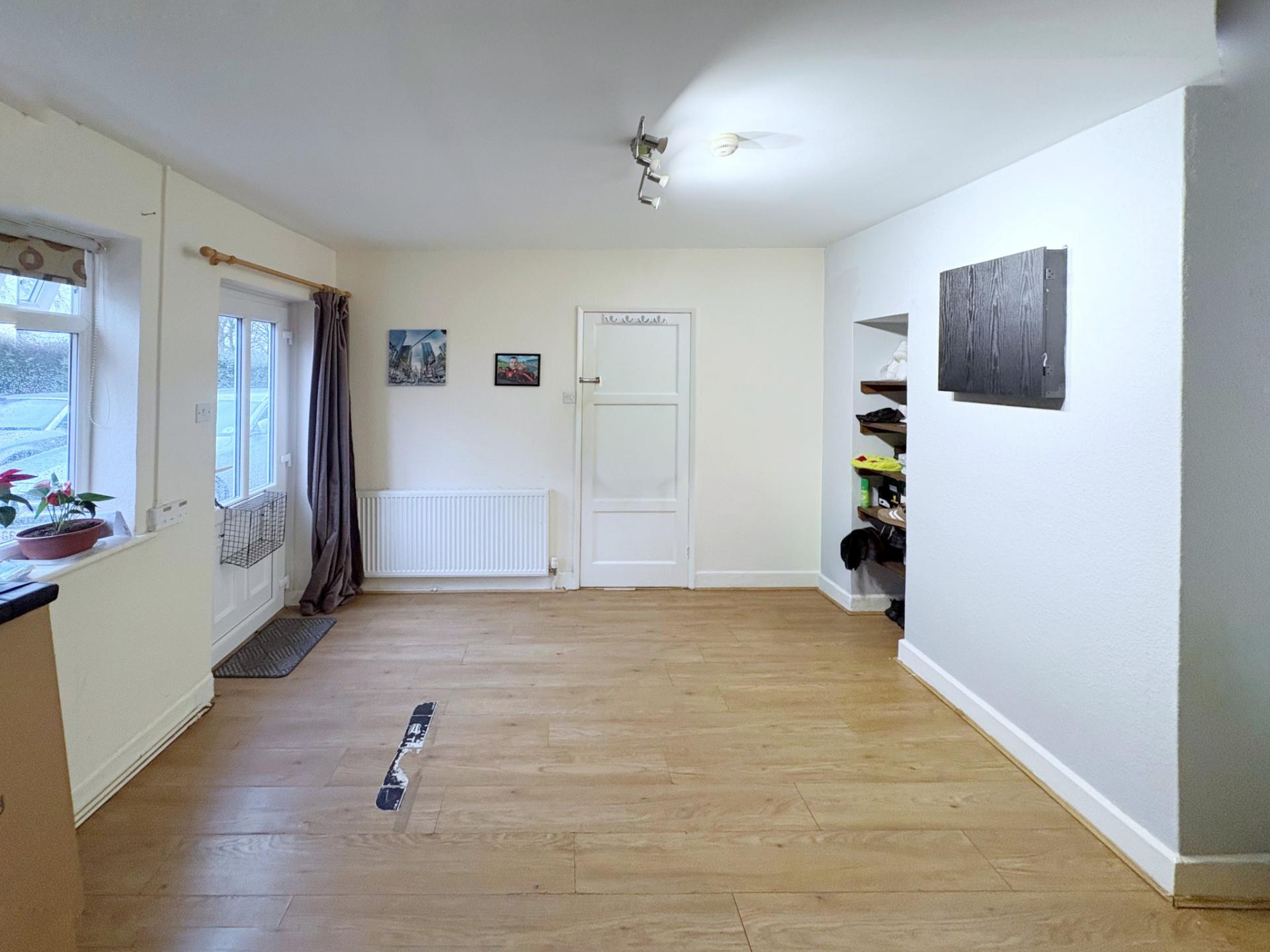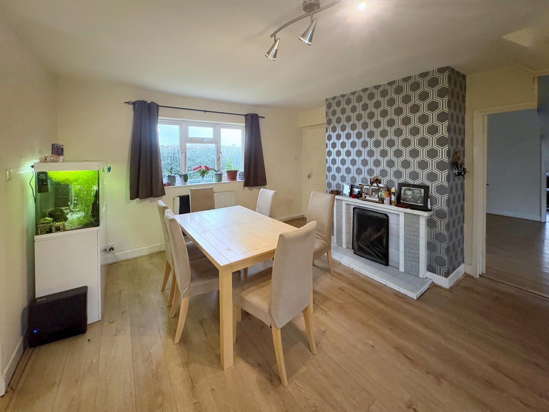 DINING AREA UPVC window, laminate flooring, open fireplace with decorative surround.