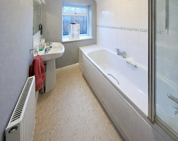 BATHROOM 6' 5" x 5' 4" (1.97m x 1.65m) Panelled bath with shower over and glazed screen, pedestal wash hand basin, radiator, UPVC window.