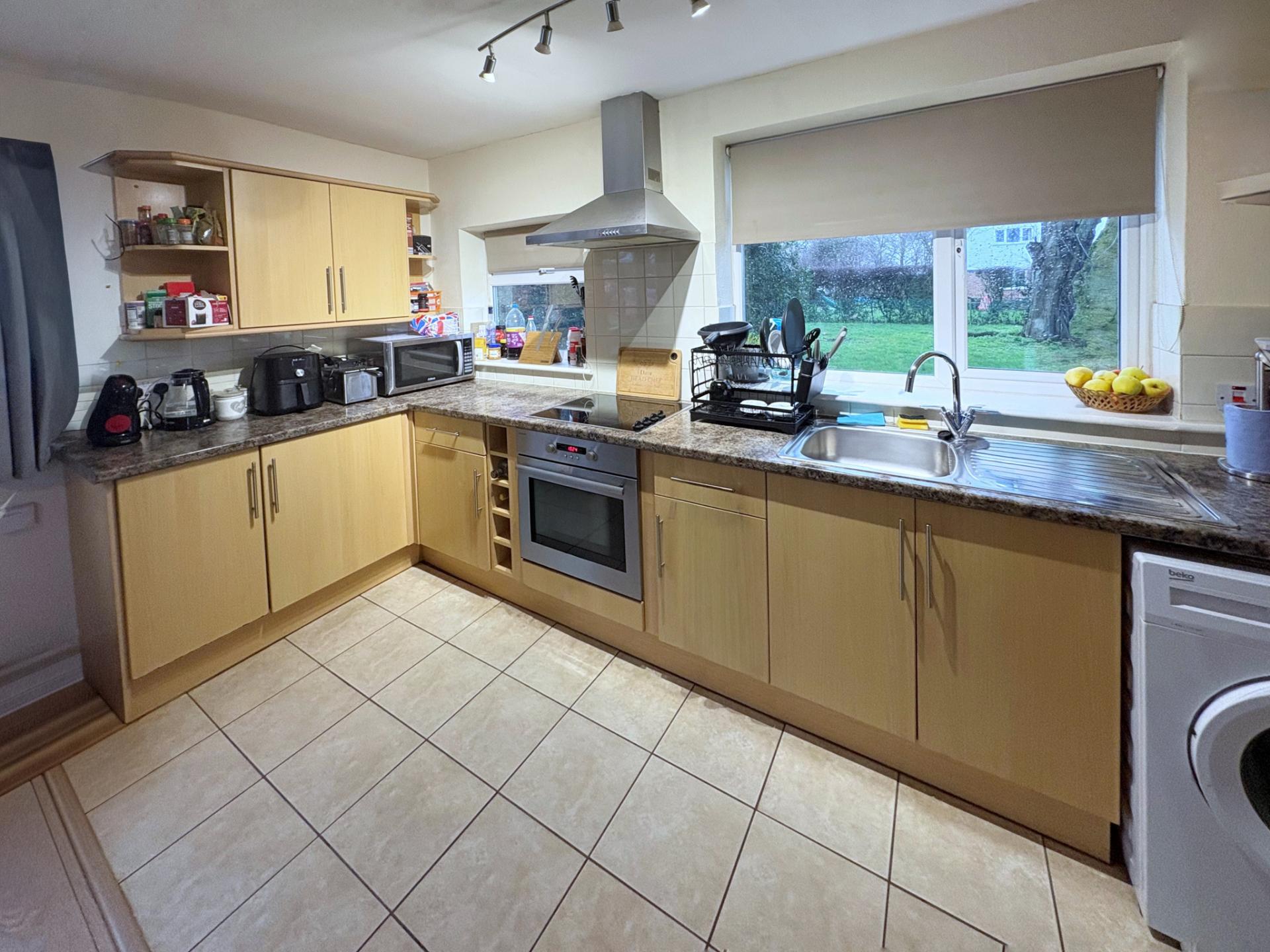 KITCHEN AREA Extensive range of base cupboards and drawers, stainless steel sink unit with mixer tap, worktops, eye level wall cupboards, end display shelves, appliance space, built-in electric oven, hob and multi speed cooker hood, 2 UPVC windows to the side elevation, ceramic floor tiles, range of spotlights, walk-in pantry.