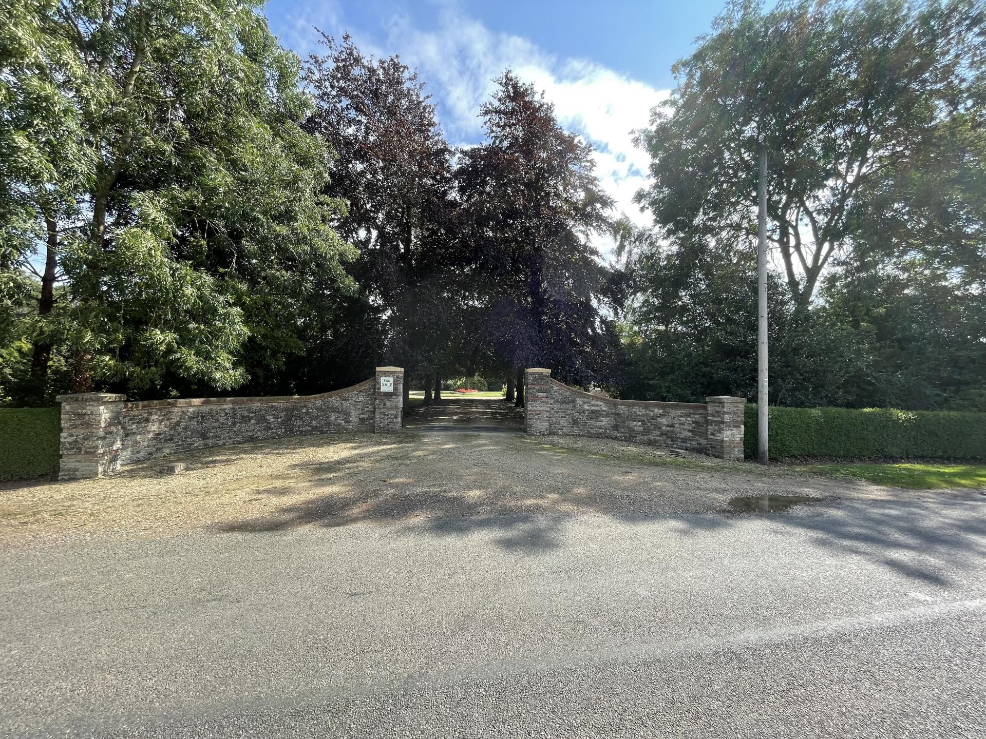 The property is approached between twin gates with a decorative shaped wall to a tree lined driveway opening on to an extensive driveway and multiple parking area with access to: