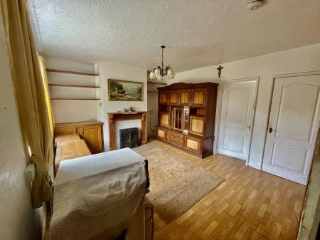 LOUNGE 11' 11" x 14' 3" (3.65m x 4.35m) UPVC double glazed window to the rear elevation, textured ceiling, centre light point, double radiator, feature fireplace with marble effect insert and tiled hearth and fitted Parkray fire, fitted storage cupboard into recess, understairs storage cupboard with shelving, staircase rising to first floor. Door into: