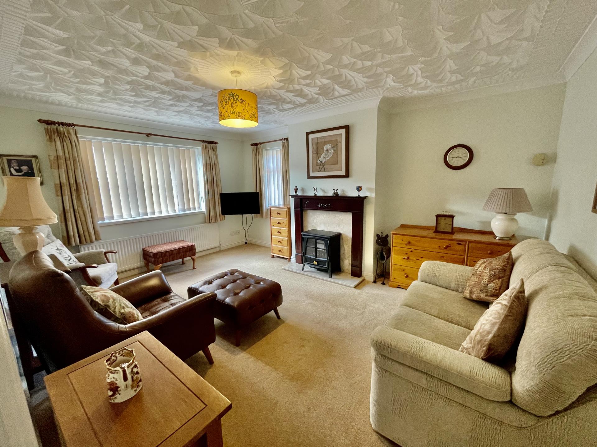 LOUNGE 11' 8" x 15' 6" (3.57m x 4.74m) UPVC double glazed window to the front and side elevations, coved and textured ceiling, centre light point, radiator, TV point, telephone point, feature wooden fireplace with marble inserts and hearth with fitted stoves coal effect electric fire, central heating thermostat, door into: