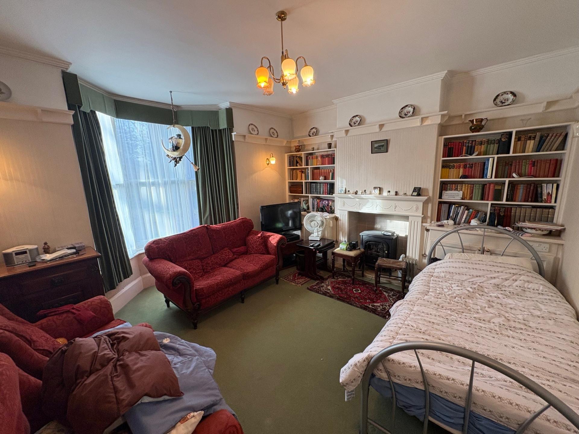 SITTING ROOM 15' 10" x 12' 0" (4.84m x 3.68m) plus sash bay window overlooking the churchyard. Adams style fireplace, secondary glazed window, double radiator, delft rack, twin alcoves with store cupboards and shelving.