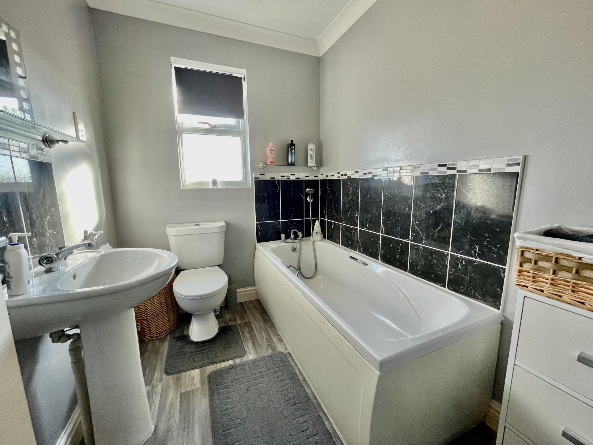 FAMILY BATHROOM: 5' 11" x 7' 8" (1.81m x 2.34m) obscured UPVC double glazed window to the rear elevation, skimmed and coved ceiling, centre light point, extractor fan, vinyl plank flooring, radiator, fitted with a three piece suite comprising low level WC, pedestal wash hand basin with tiled splashbacks, glass shelf, mirror and shaver point, bath with mixer tap and fitted shower attachment tap.