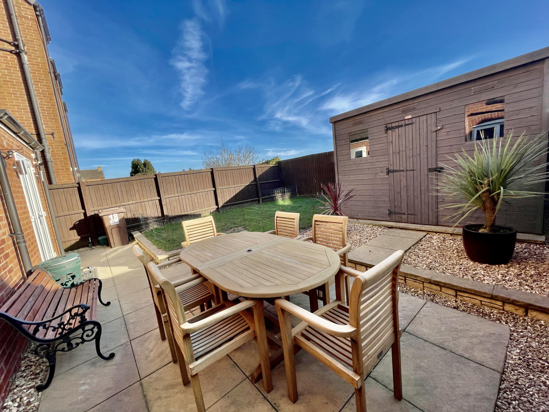 REAR GARDEN Wooden gate leading into rear garden with extensive flagstone patio area, lighting, cold water tap, gravelled raised area, lawned area, garden shed. Fenced boundaries to both sides and to the rear elevations.