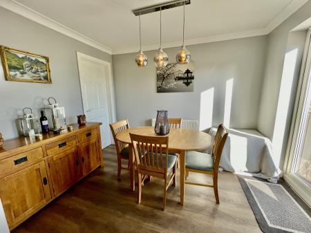 DINING ROOM 8' 0" x 11' 1" (2.45m x 3.39m) skimmed and coved ceiling, centre light point, UPVC double glazed French doors to the rear elevation, oak effect laminate flooring, double radiator. Door into: