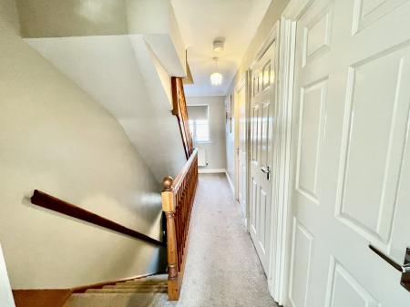 ENTRANCE LOBBY 4' 7" x 4' 9" (1.41m x 1.46m) skimmed and coved ceiling, centre spotlight fitment, smoke alarm, radiator, BT point, staircase rising to first floor, door to: