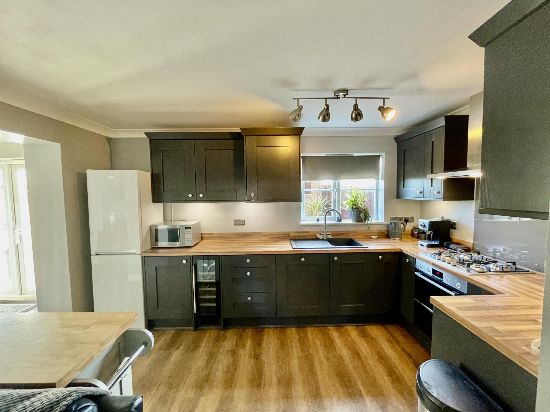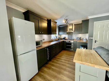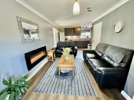 OPEN PLAN LOUNGE/KITCHEN 13' 8" x 23' 9" (4.18m x 7.24m) skimmed and coved ceiling, centre light point, centre spotlight fitment to the kitchen area, UPVC double glazed window to the front elevation, double radiator, TV point, telephone point, oak effect laminate flooring. The Kitchen area has UPVC double glazed window to the rear elevation, fitted with a wide range of base and eye level units, work surfaces over, inset sink with swan mixer tap, integrated Bosch double fan assisted stainless steel oven, integrated Bosch 4 ring gas hob, Bosch stainless steel canopy extractor hood over, integrated dishwasher and wine cooler, space for fridge freezer, under cabinet lighting, concealed Vaillant boiler (3 years old with 2 year warranty remaining), square archway into Dining Room.