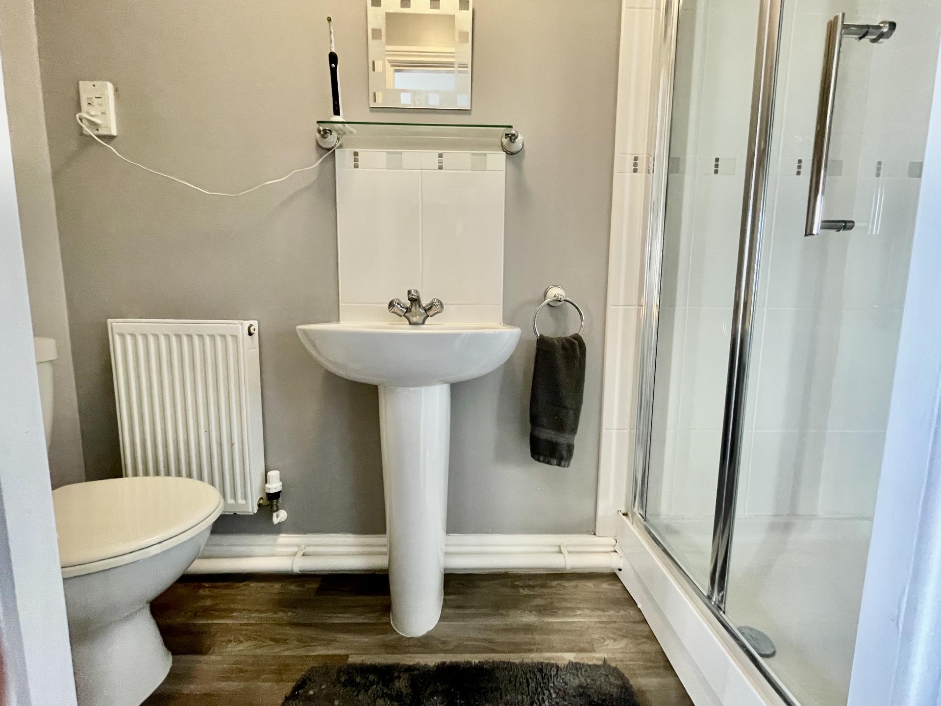 EN-SUITE 2' 10" x 8' 8" (0.88m x 2.65m) skimmed and coved ceiling, centre light point, radiator, extractor fan, vinyl plank flooring, radiator, fitted with a three piece suite comprising low level WC, pedestal wash hand basin with mixer tap and tiled splashbacks, glass shelf and mirror over, fully tiled shower cubicle with fitted thermostatic shower over.