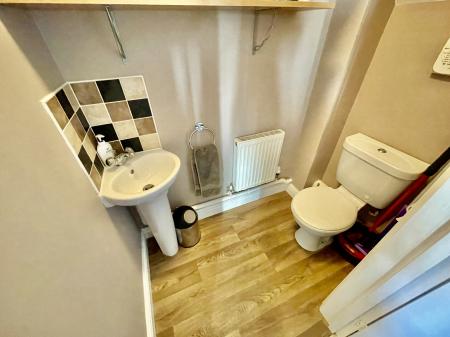 CLOAKROOM 3' 2" x 5' 6" (0.97m x 1.69m) skimmed ceiling, centre light point, extractor fan, radiator, fitted shelving, vinyl plank flooring, fitted with a two piece suite comprising low level WC, pedestal wash hand basin with mixer tap and tiled splashbacks.