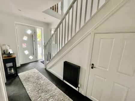ENTRANCE HALLWAY 7' 0" x 13' 6" (2.14m x 4.13m) Skimmed ceiling, inset LED lighting, smoke alarm, understairs storage cupboard, double radiator, telephone point, central heating thermostat, staircase rising to first floor, solid oak door into: