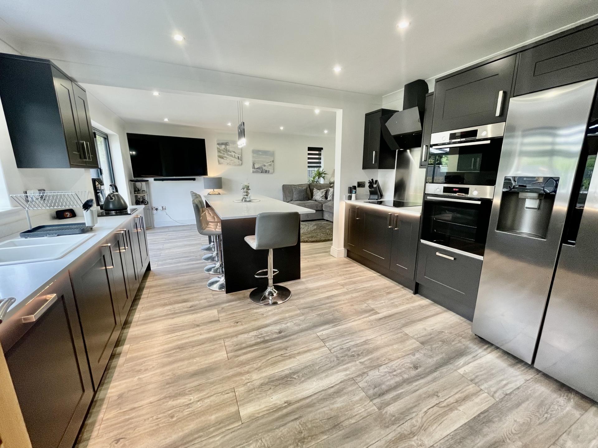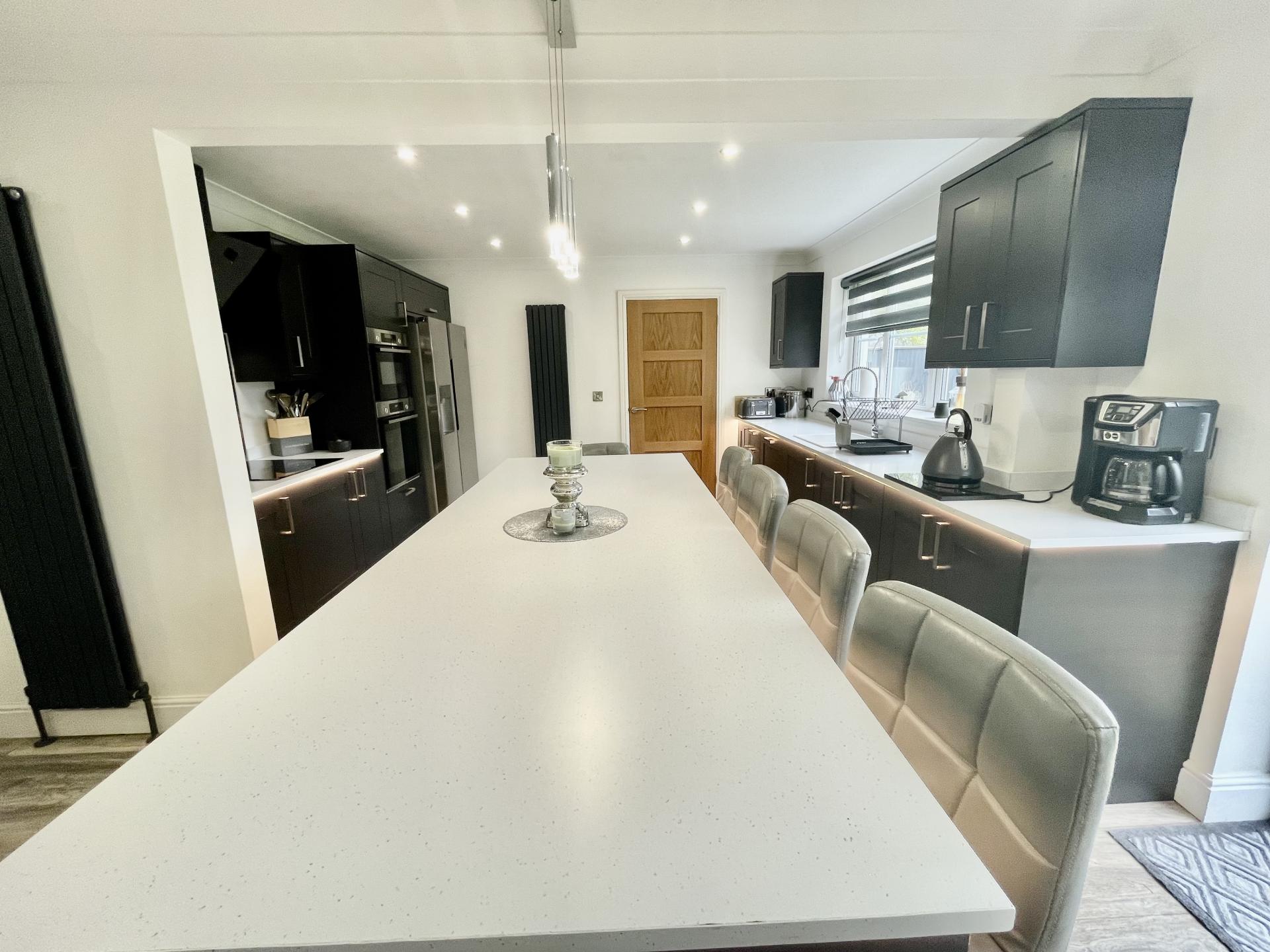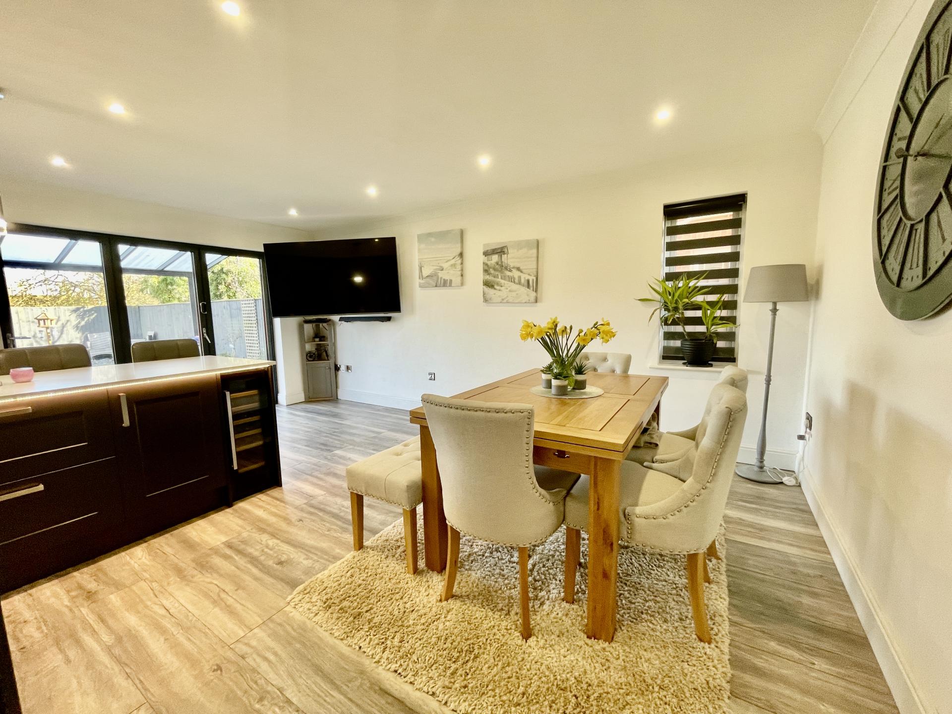 DINING AREA TV point, inset LED lighting, skimmed and coved ceiling, bi-fold doors to the rear elevation, central island with drawer units and under cabinet lighting, wine cooler.