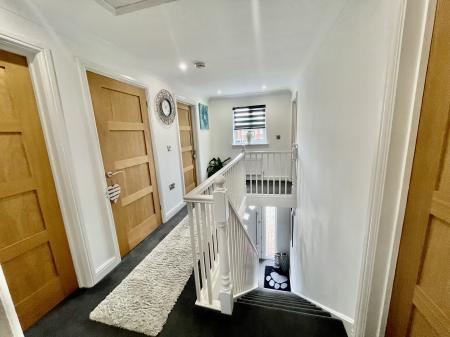 FIRST FLOOR GALLERIED LANDING 7' 1" x 16' 0" (2.18m x 4.89m) Georgian style UPVC double glazed window to the front elevation, skimmed and coved ceiling, inset LED lighting, smoke alarm, double radiator, access to loft space (boarded), Airing Cupboard with fitted hot water cylinder and slatted shelving.