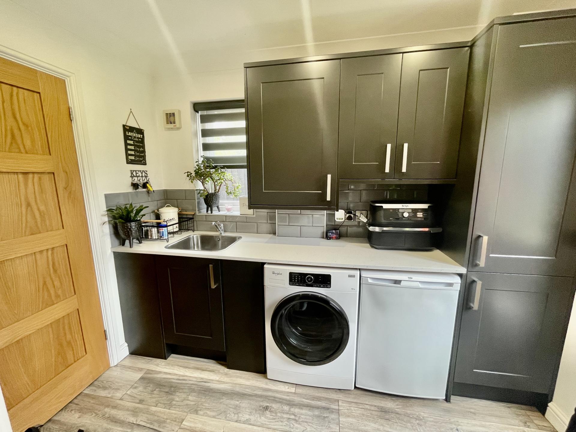 UTILITY ROOM 5' 9" x 10' 0" (1.77m x 3.07m) Georgian style UPVC double glazed window to the side elevation, obscured UPVC double glazed door to the rear elevation, skimmed and coved ceiling, inset LED lighting, fitted oak style laminate flooring, radiator, fitted with a range of base, eye level and larder units, work surfaces over, tiled splashbacks, inset stainless steel square bowl sink with mixer tap, plumbing and space for washing machine, space for freezer/tumble dryer, extractor fan. Solid oak door into:
