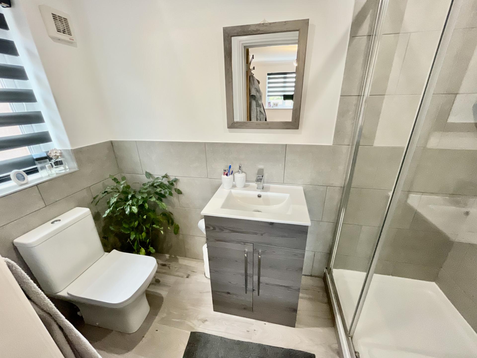 EN-SUITE SHOWER ROOM 4' 0" x 8' 8" (1.22m x 2.66m) Obscured UPVC double glazed window to the side elevation, skimmed and coved ceiling, inset LED lighting, extractor fan, laminate flooring, radiator, recently refitted with a three piece suite comprising low level WC, wash hand basin with mixer tap fitted into vanity unit with storage below, double sized shower cubicle with stainless steel sliding doors with fitted thermostatic shower over with rainfall shower and attachment tap.