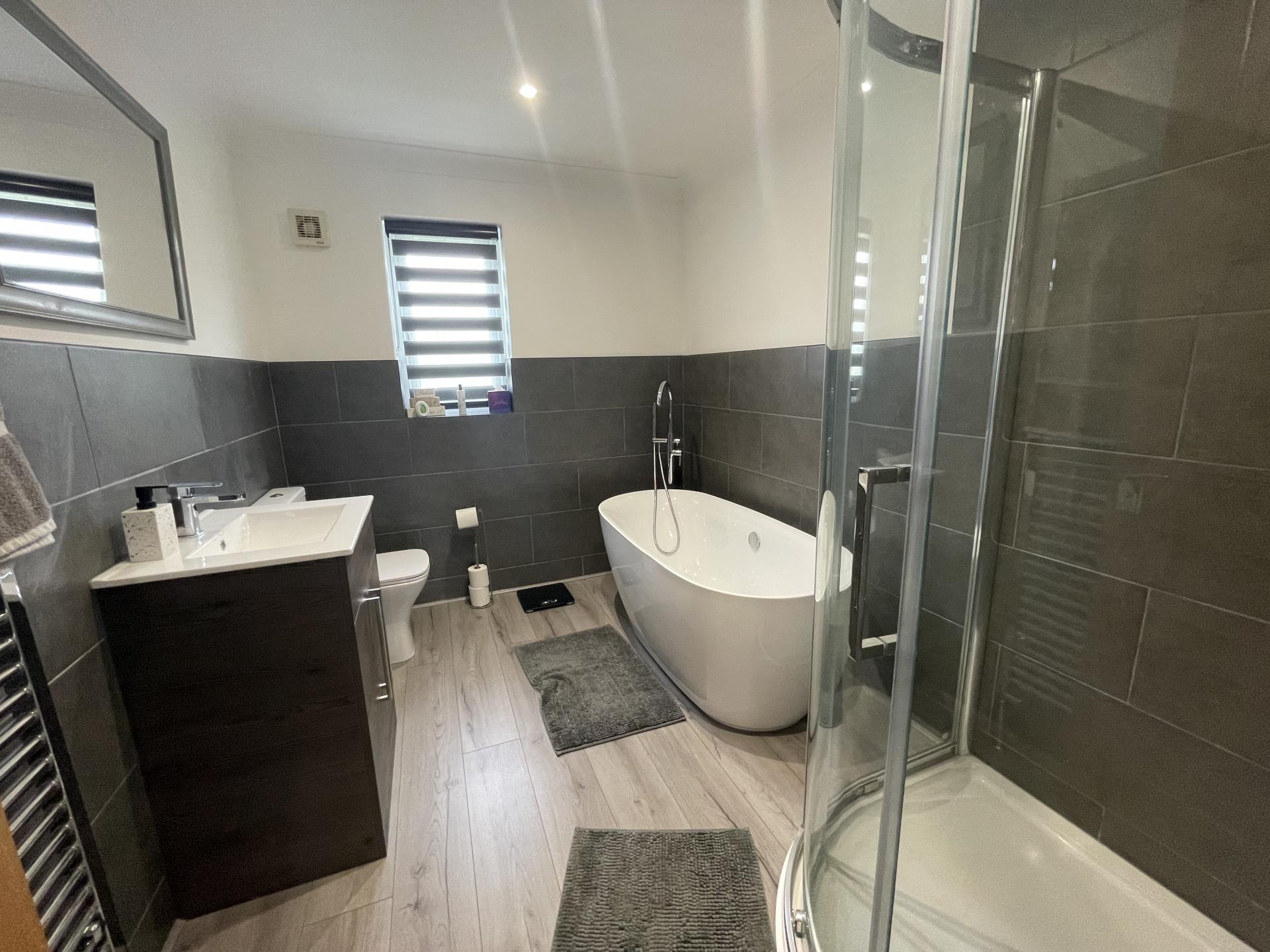 FAMILY BATHROOM 7' 2" x 9' 8" (2.2m x 2.97m) Obscured UPVC double glazed window to the rear elevation, part wall tiling, fitted oak effect laminate flooring, skimmed and coved ceiling, inset LED lighting, stainless steel towel rail. Fitted with a four piece suite comprising low level WC, wash hand basin fitted into vanity unit with storage below with mixer tap over, shower cubicle with fitted thermostatic shower over with rainfall shower head and further shower attachment tap, freestanding oval bath with mixer tap and further shower attachment tap.