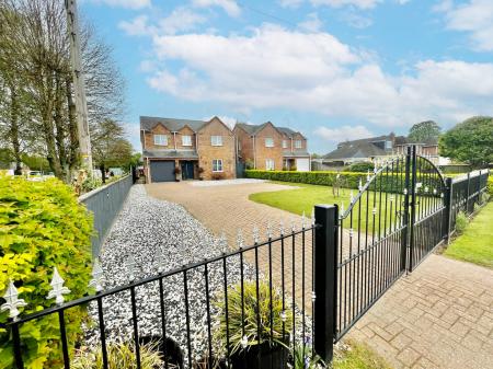 EXTERIOR Wrought iron fencing and with wrought iron gated access on to driveway with turning bay providing multiple off-road parking, there is lawn to the right hand side of the driveway and gravel to the other side. Extensive lighting. Side wrought iron gated access with paved pathways leading to the rear.