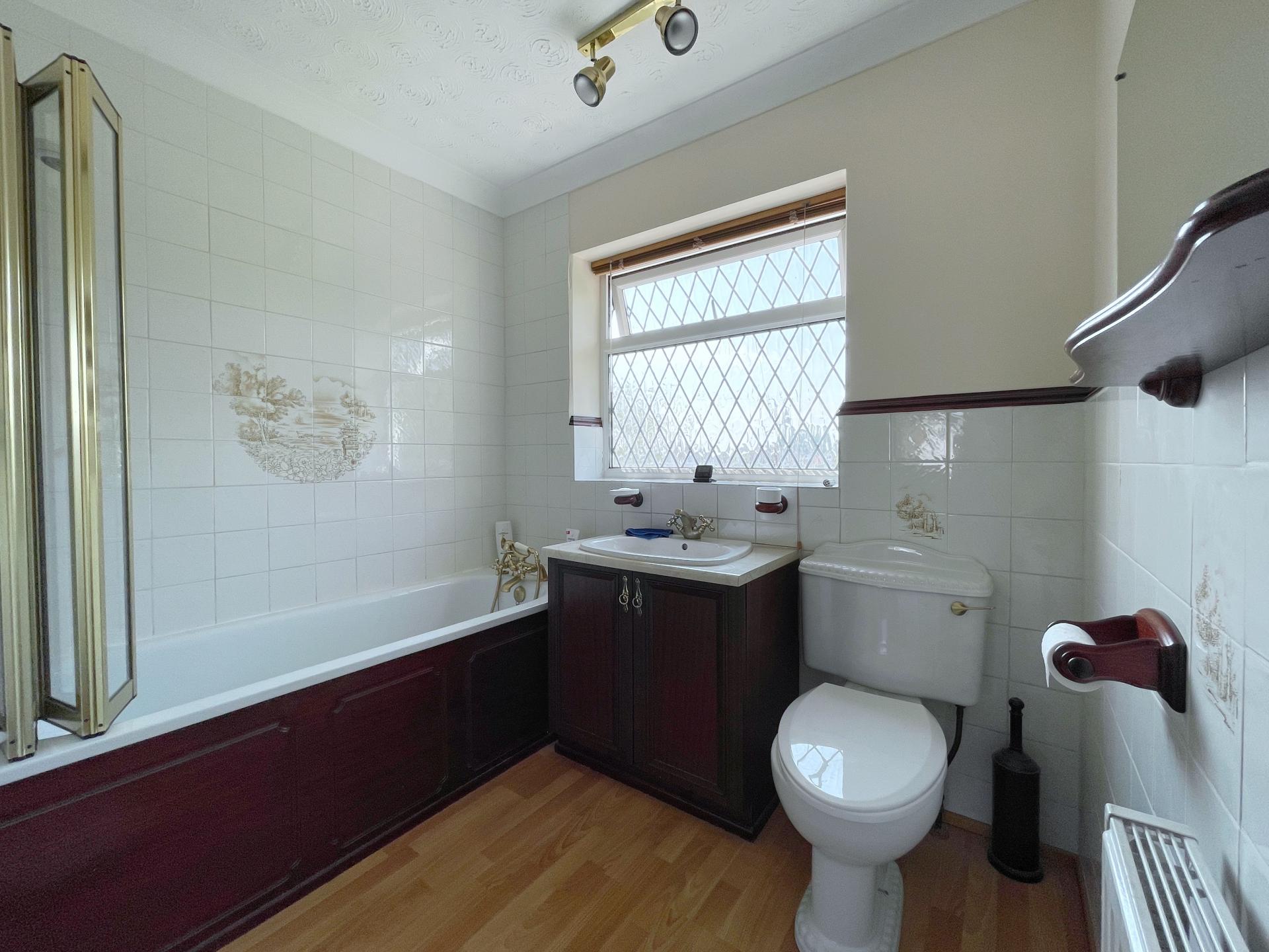 FAMILY BATHROOM 8' 3" x 7' 5" (2.54m x 2.27m) With obscure leaded UPVC double glazed window to the rear elevation, textured and coved ceiling with centre spotlight, oak effect laminated flooring, radiator, part tiled walls, full tiling to bath area, fitted with a three piece suite comprising of low level WC, wash hand basin fitted into vanity unit with storage below, mixer tap, bath with telephone shower mixer tap, Triton power shower over the bath with shower screen.