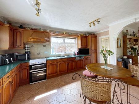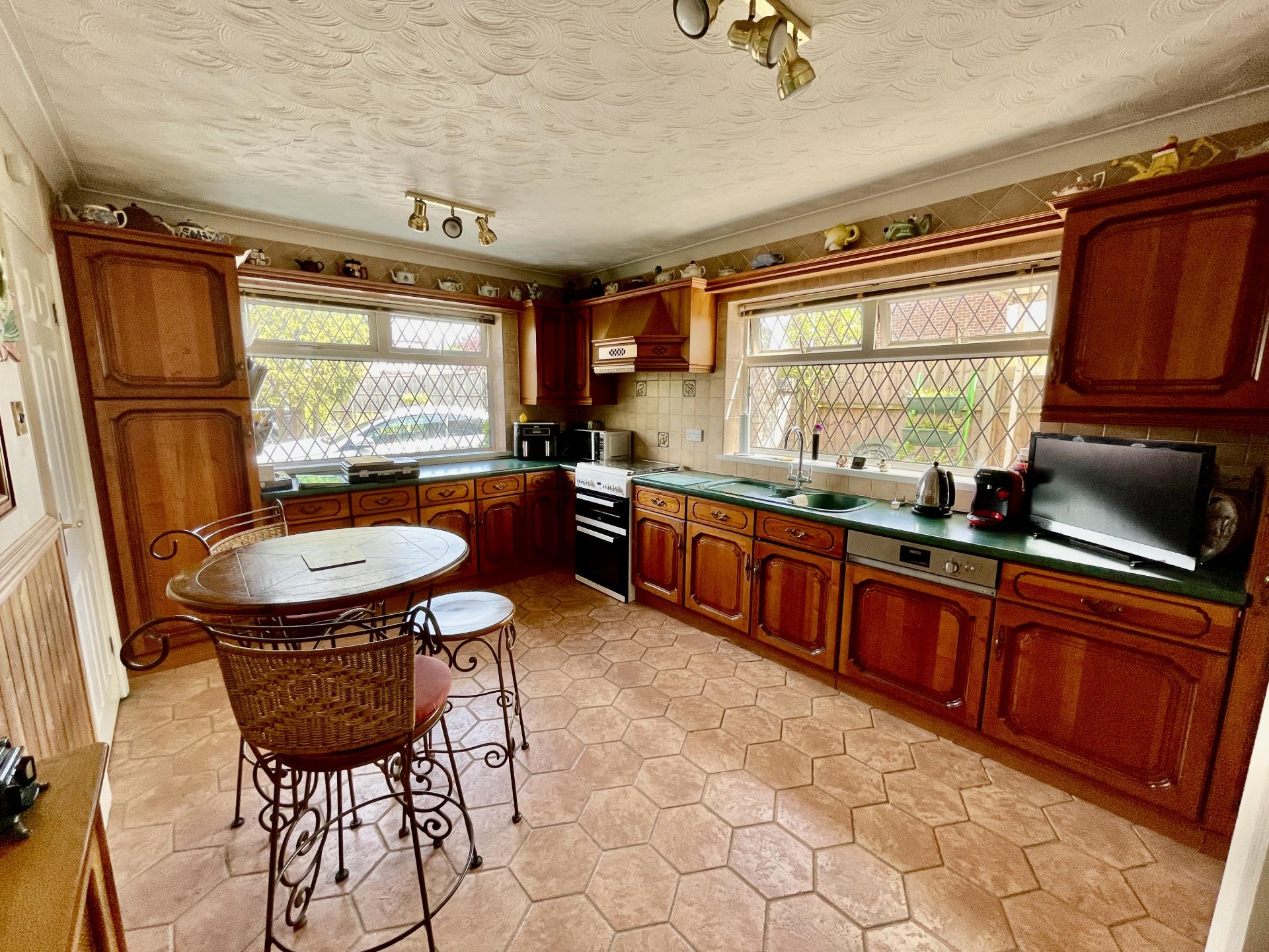 KITCHEN/DINER 10' 6" x 15' 10" (3.22m x 4.83m) With leaded UPVC double glazed window to the front and side elevations, textured and coved ceiling with 2 x centre spotlight fitments, 2 x fitted picture wall lights, radiator with cover, tiled flooring, part tiled walls, fitted with a wide range of base, eye level and tall boy units with further drawer units with preparation surfaces over tiled splash backs with integrated eye level fridge, integrated Zanussi dishwasher, free standing gas Beko cooker with built in canopy extractor hood over, central heating controls, door off leading into: