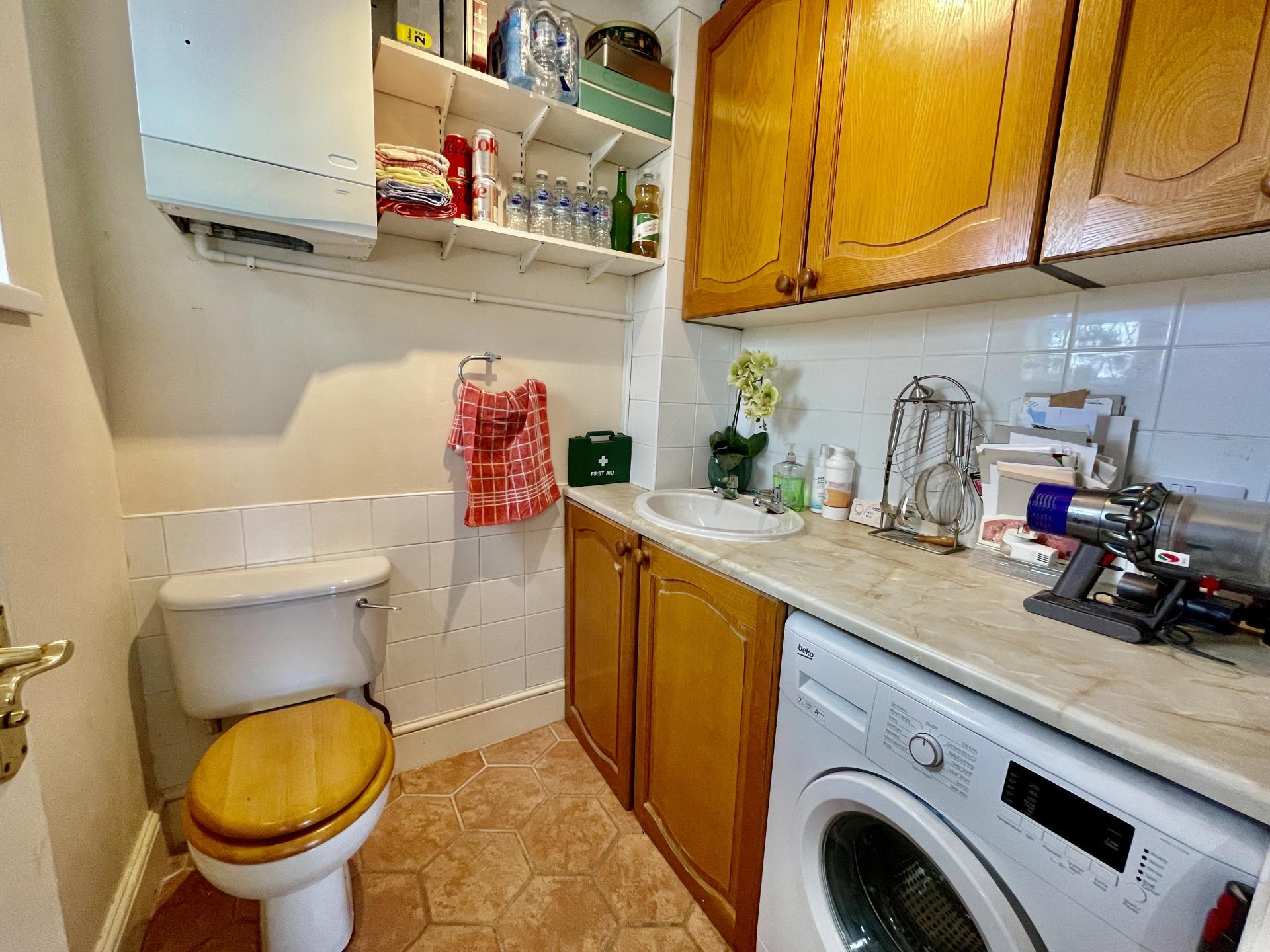 UTILILTY ROOM / CLOAK ROOM 5' 4" x 5' 8" (1.65m x 1.74m) With obscure leaded UPVC double glazed window to the side elevation, textured and coved ceiling with centre spotlight fitment, coordinating tiled flooring, fitted with a two piece suite comprising of low level WC, wash hand basin fitted into vanity unit with storage below, plumbing and space for washing machine, fitted wall cabinets, single radiator.