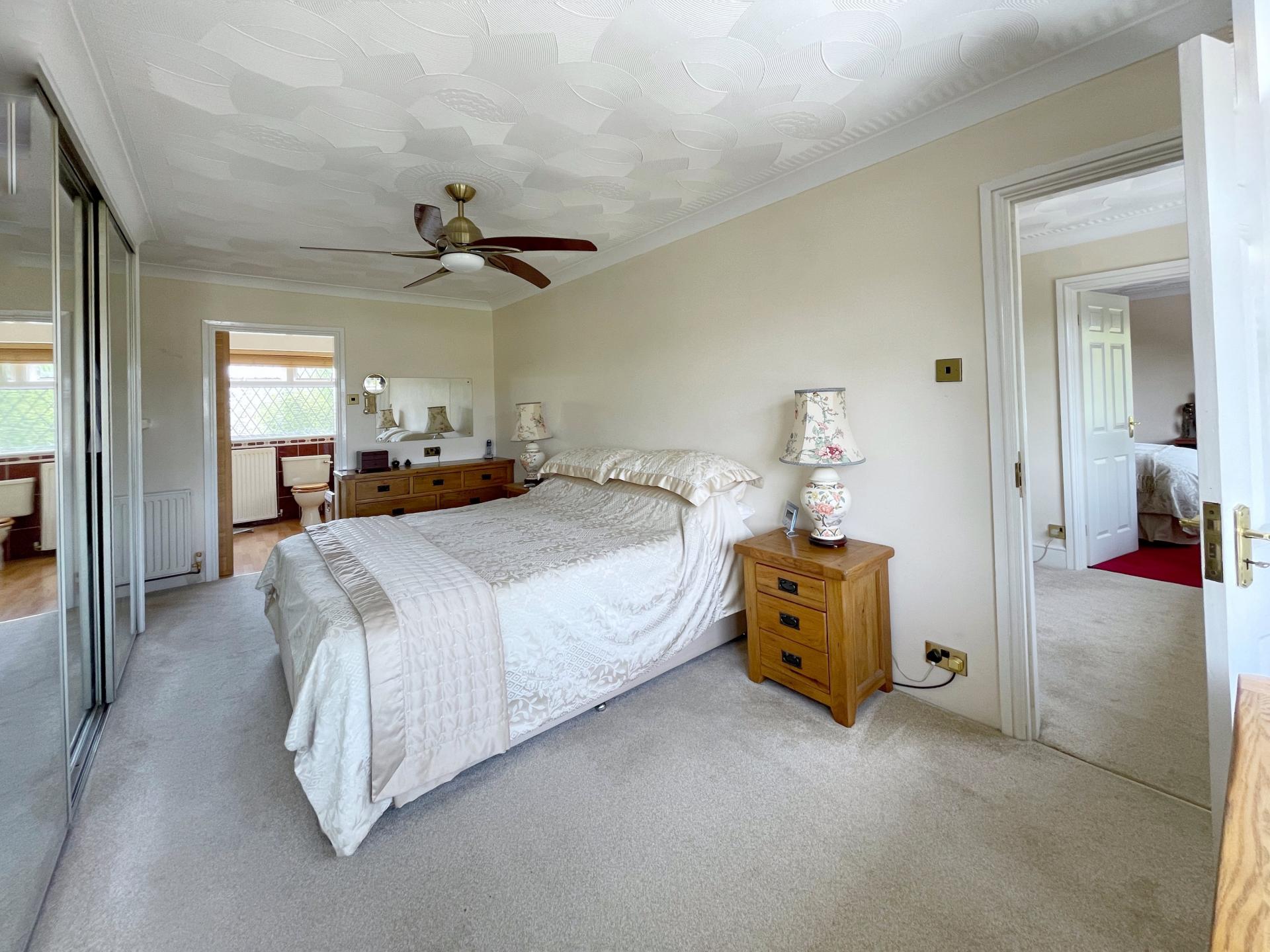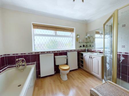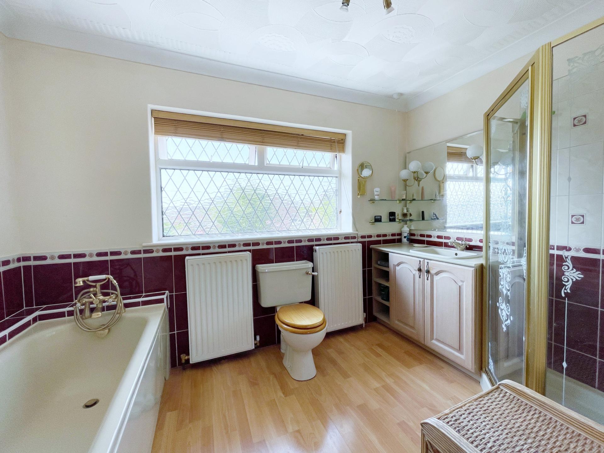 MASTER ENSUITE 6' 9" x 10' 7" (2.07m x 3.25m) With obscure leaded UPVC double glazed window to the rear elevation, textured and coved ceiling with centre spotlight fitment, extractor fan, oak effect laminated flooring, full length heated towel rail, 2 x single radiators, fitted with four piece suite comprising of low level WC, wash hand basin with mixer tap fitted into vanity unit with storage below and shelving, full length glass mirror over, 2 x wall lights, walk-in shower enclosure with fitted thermostatic shower over, fully tiled, bath with part tiling, telephone shower mixer tap.