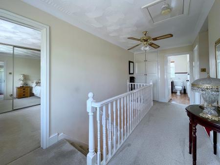 FIRST FLOOR GALLERIED LANDING 7' 4" x 16' 5" (2.25m x 5.01m) UPVC leaded double glazed window to the front elevation, textured and coved ceiling with centre fan light, loft access, smoke alarm, fitted storage cupboard off with double doors housing hot water cylinder, slatted shelving, over-storage, double radiator with cover.
