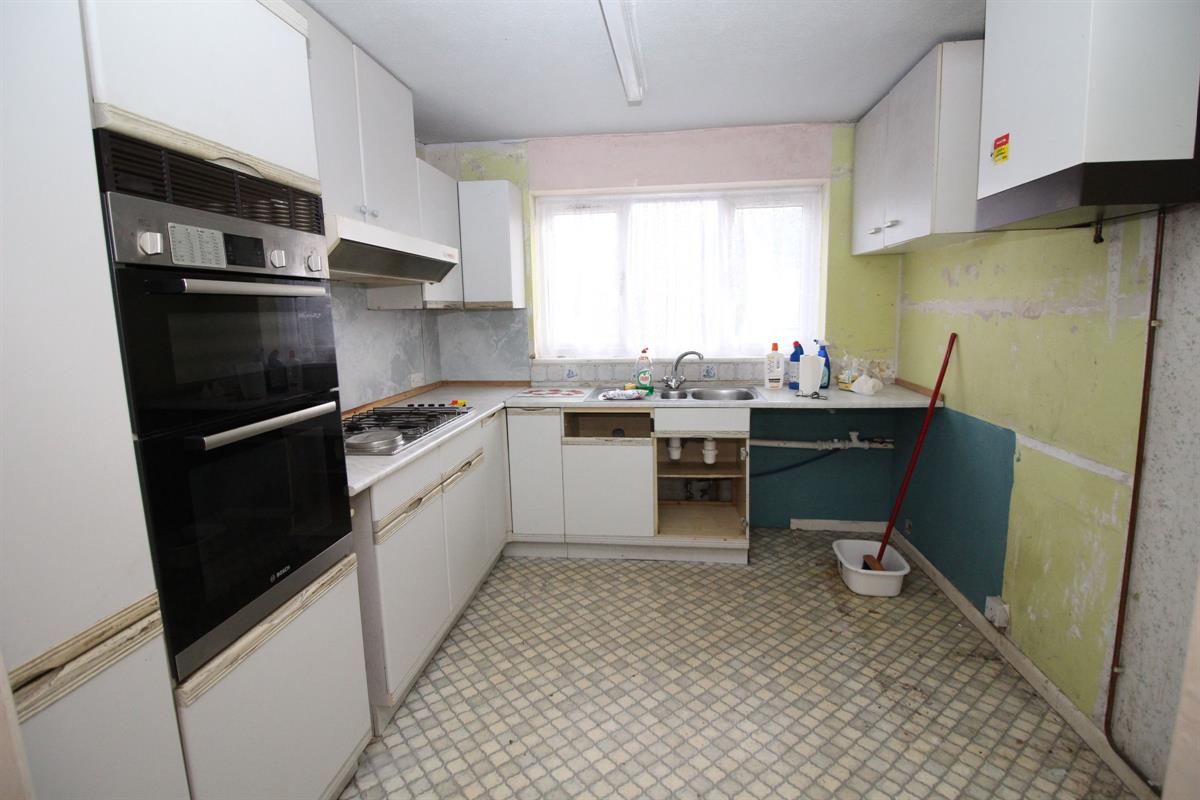 Fitted with a range of laminated fronted units comprising of rolled edge work surfaces with cupboards and drawers below, single drainer sink unit, matching eye level cupboard, gas and electric combi hob with extractor hood over, fitted oven and grill, wall mounted gas boiler (central heating not currently working), double glazed front window.