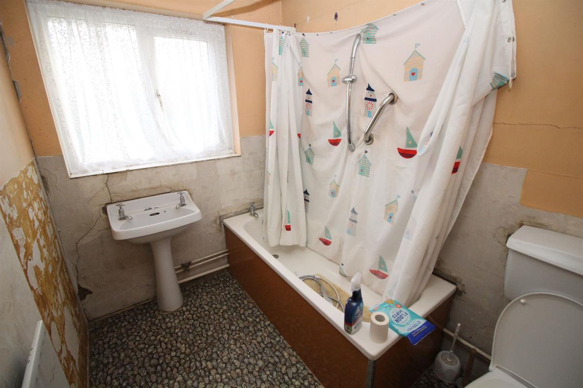 White suite with panelled bath, pedestal wash hand basin, low level WC, radiator, double glazed front window
